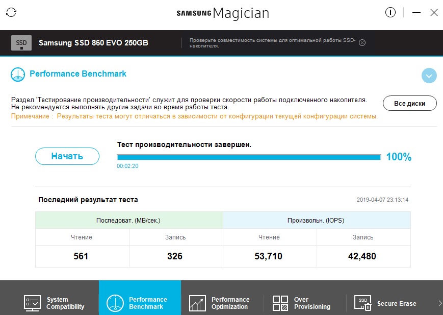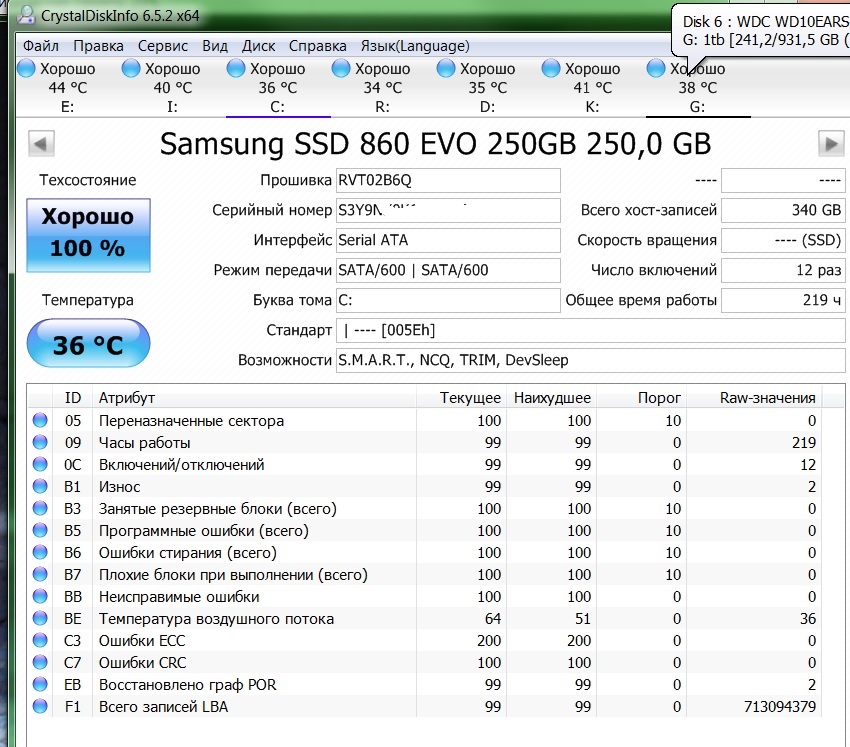 Добавлено спустя 10 минут 9 секунд: кстате вопрос на засыпку),щас заодно решил прогнать через cdм 860ево,и там тоже какаято фигня с записью,320 метров выдает+- пару мегобайт. вот когда купил его прогнал cdм, все было норм. вот в этом сообщении под спойлером самсунг 860 там его скорости на тот момент. после того я поменял адату и самсунг портами на плате,хотя в принципе эт савсем не обязательно ,адату в сата2 порт,самс в сата1 короче. но после смены я кажись не тестил. свободно также около 130 гб на нем из 233, порты на плате сата3 все. посмотрел в дисках,везде актуальный режим -ультра дма 6 самсунговская фигнЯ тож самое пишет