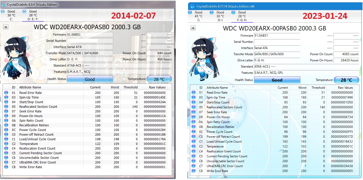 WD20EARX Green 2TB - 'CrystalDisk Info' - сравнение 2014 г. vs. 2023 г.