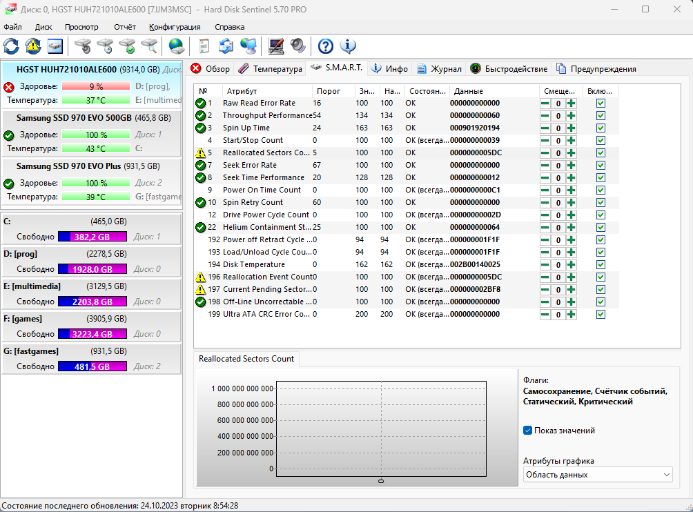 Приветствую. Диск Western Digital Ultrastar DC HC510 10 Тб HUH721010ALE600 купил на авито. Поставил в системник почти месяц назад (27 сентября) работал без проблем в основном под торрентами и как хранилище видео (не системный диск). Пару дней назад заметил притормаживание при работе с диском в проводнике. Запустил HDSentinel, CrystalDiskInfo и Victoria и ужаснулся показателям смарт. К сожалению в виктории скрин не полный, сразу не подумал.