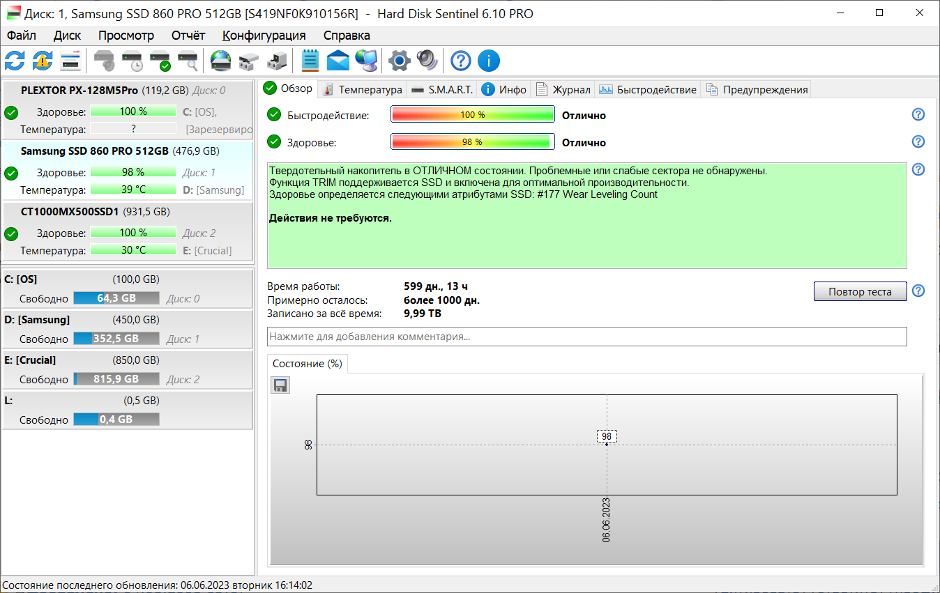 а вот HDD Hitachi HDS721010CLA332 1ТБ не выдержал.. отработал с 2011г. по октябрь 2019г и начал сыпать переназначенными 05, добавлять по 1-2 в день.. его место занял IronWolf [ST2000VN004], в апреле 2022 "переехал" во внешний HDD/SSD USB BOX. ему там лучше бОльшую часть времени отдыхает, лежит себе на полке. включаю только для забекапить чего, перенести с SSD системника, или торрент качнуть. иногда и неделями не включается. при подключении обязательно с KeepAliveHD чтобы не парковался через 2 минуты если нет обращений. отключение с USB Safely Remove.