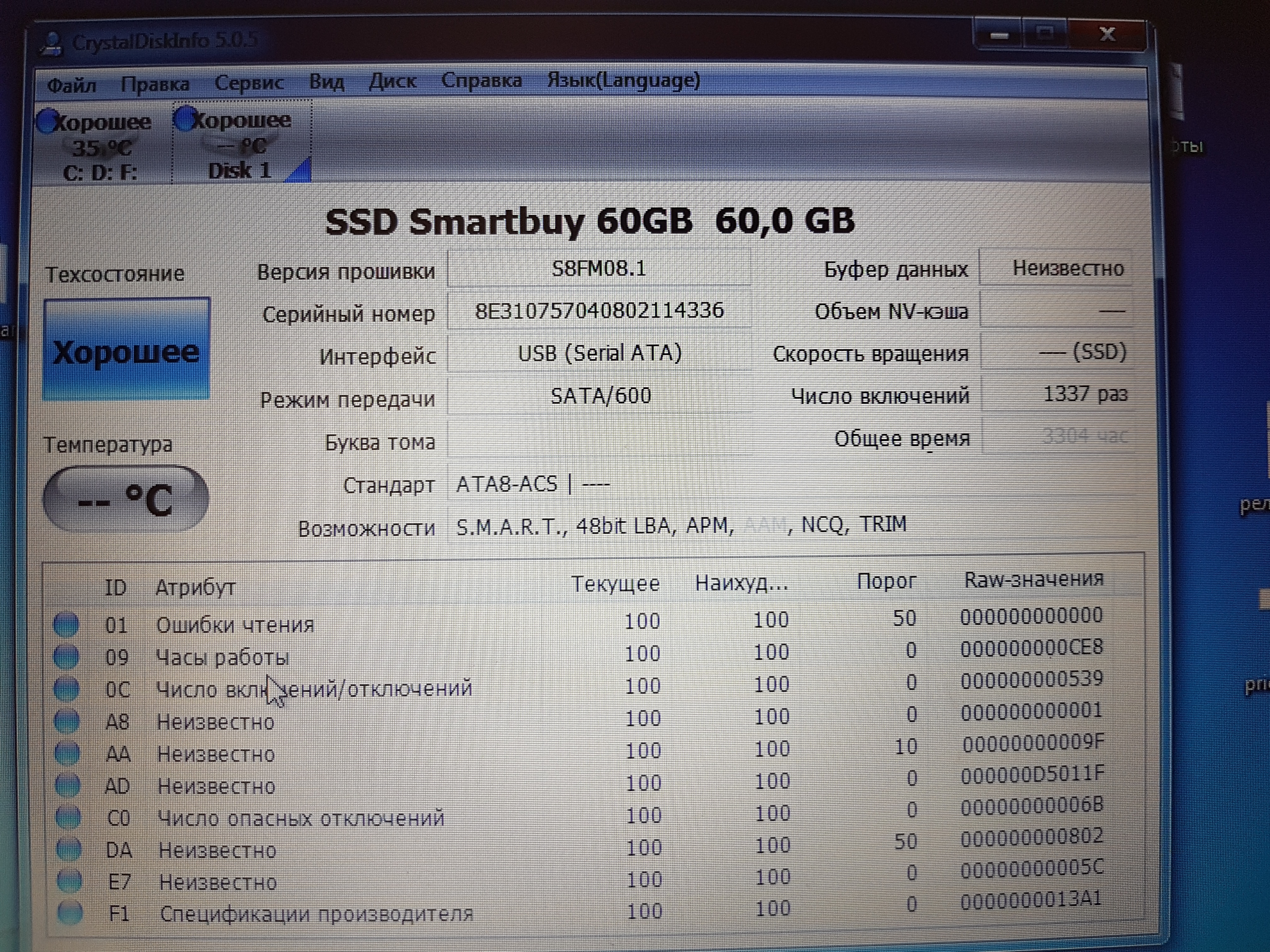 Я бы так и думал, если бы не более полугодовалая работа в этой же конфигурации. Кстати, про smart что-то забыл. Сейчас проверю. И еще нюанс, когда ставим ssd внутрь, а винт в бокс и запускам систему с винта соответственно, то комп ssd видит и объем показывает нормально, но работать с ним не дает