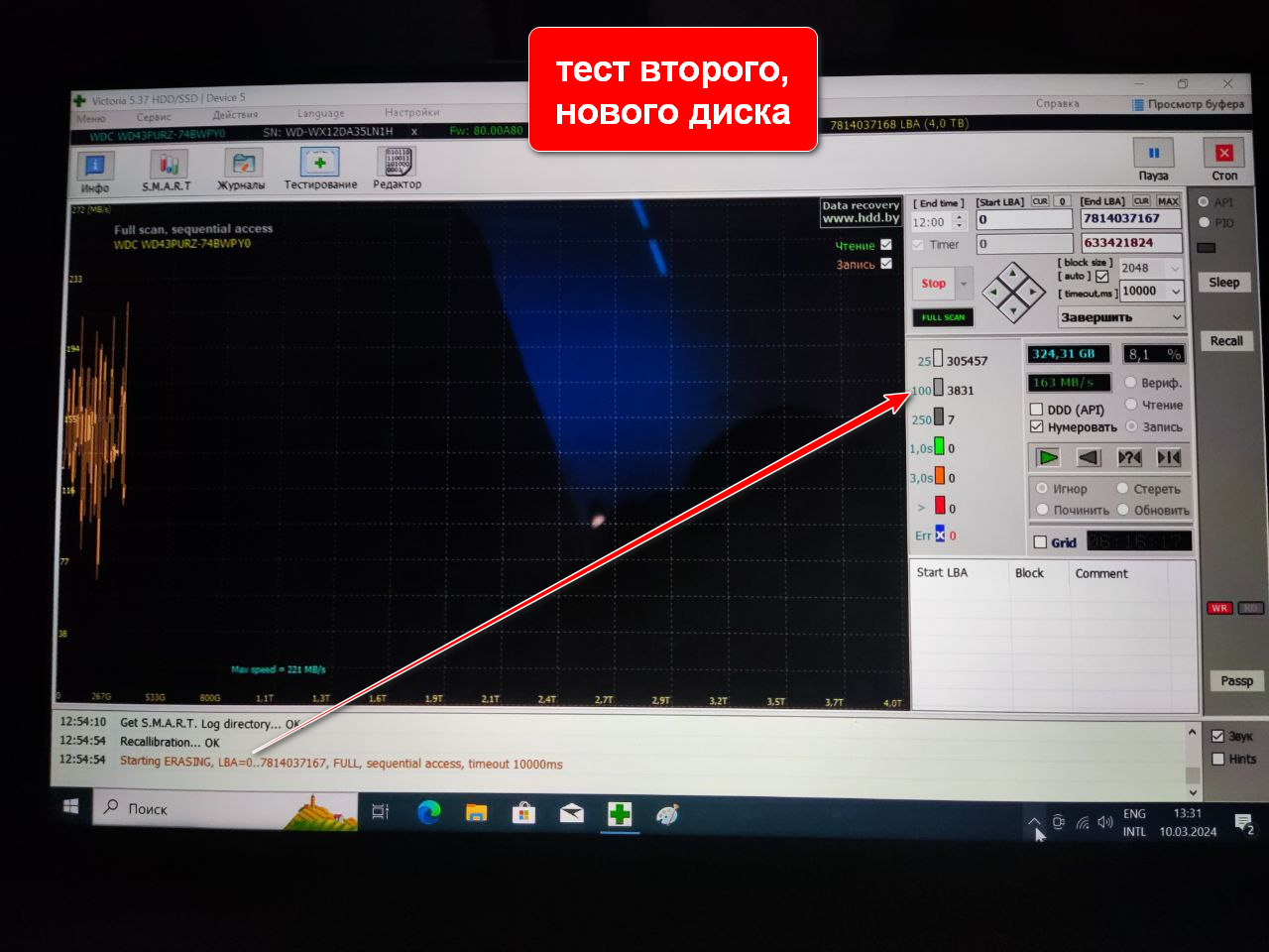 Только начал тест записи в Виктории и заметил, что значения которые указаны стрелкой на скрине ниже (скрин теста первого диска из этого https://forums.overclockers.ru/viewtopic.php?p=18162975#p18162975 ) - отличаются на новом диске: если на первом диске, как видно на скрине, было 1220 серых секторов ЗА ВСЁ ВРЕМЯ ТЕСТА, то на новом диске, только начал тест, прошло 30 минут, и их там уже больше чем 3400... этих же секторов, а тест только начался.