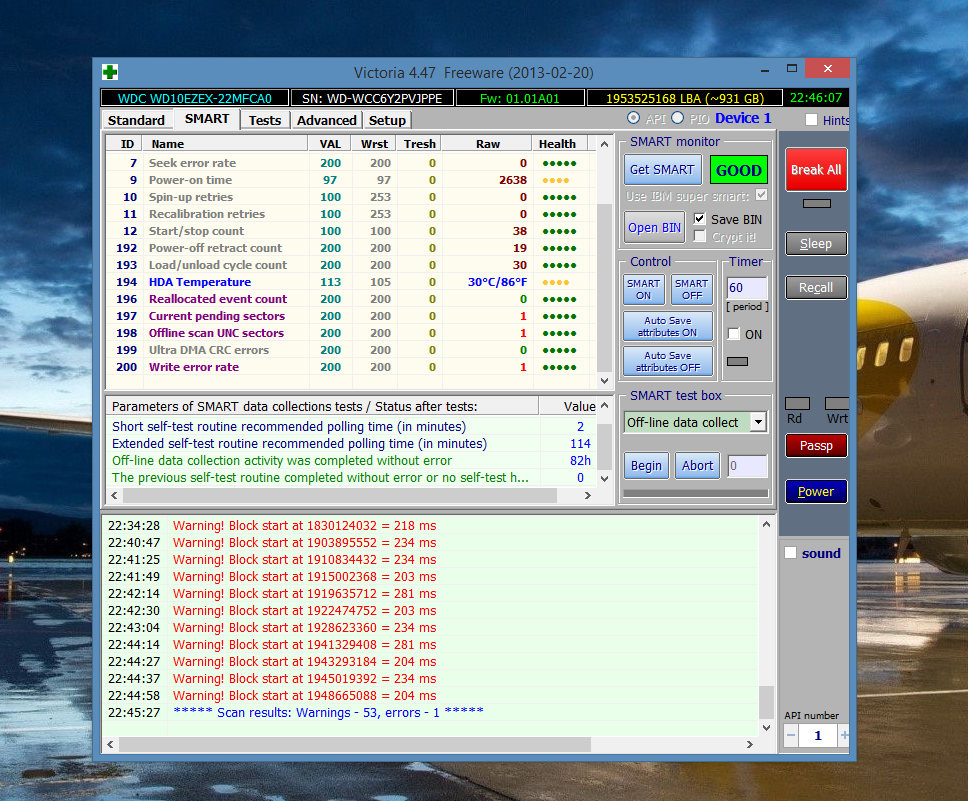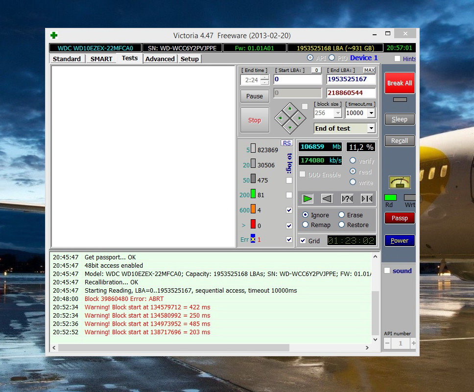 Смотря что вы собрались выяснять тестом. [Вас всё время закидывают некими посторонними фактами, а вы не ведитесь)] Как я понял, вас интересуют ошибки, раз уж вы озаботились пендингом. Удобно поискать их под виндой. Вот уже нашли блок с началом в LBA=39860480. Уже можно попробовать пересканировать этот блок (с запасом) в режиме read+remap, хотя Win может не дать прописывать, и снова будет ошибка. Вот тогда какой-нить лайв и понадобится. Abort, кстати, не та ошибка, которую ожидалось увидеть. Наверное, уже досканировали до конца. Есть ещё ошибки?