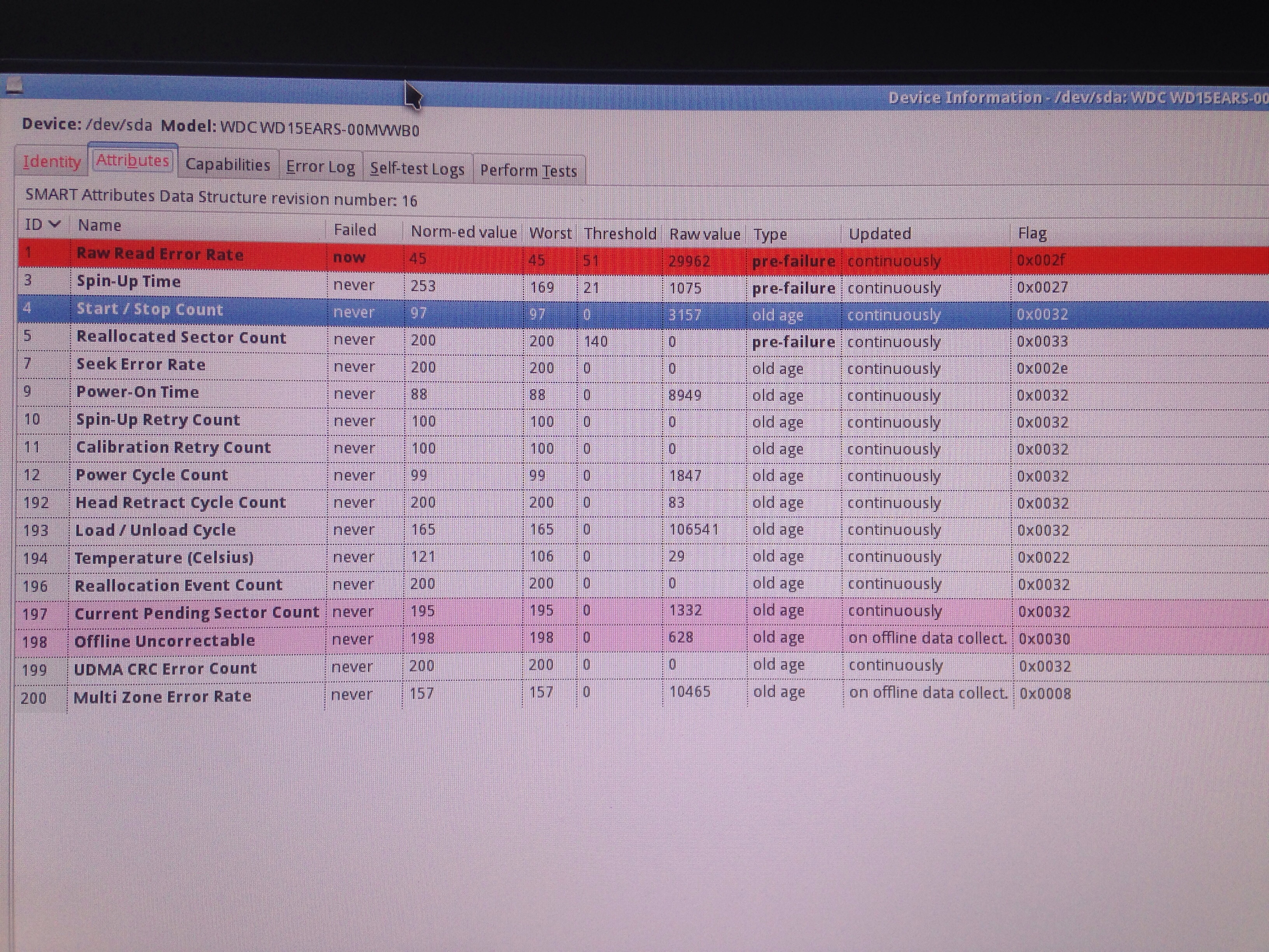 У друга уже года 2 лежит HDD 1.5 Tb WD 15EARS-00MVWB0, при загрузке BIOS выдает SATA Port ERROR. Отключил проверку SMART в BIOS - вставил Live CD - зашел в GParted SMART показывает кучу ошибок Raw Read Error Rate. Снимки смарта приложил (прошу прощения за качество на смартфон фотал с экрана). Подскажите рассматриваемый HDD можно положить на полочку и забыть? Или еще можно вернуть его к жизни... Может ошибка контроллера? Или старт/стопов слишком много?