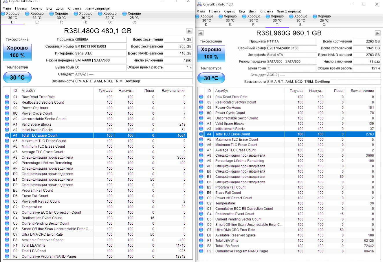 ========================================= Перед публикацией скриншотов Crystal Disk Info в меню "Сервис" >> "Дополнительно" >> "Raw-значения" выберите вариант "10 [DEC]". Это упростит восприятие информации. В меню "Сервис" ставьте галочку "Скрыть серийный номер".