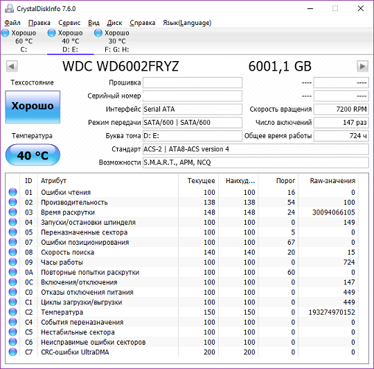 >>>При использовании Crystal Disk Info в меню Сервис>Дополнительно>Raw-значения выберите вариант "10 [DEC]" это несколько упростит восприятие информации утилиты форумчанами.<<<