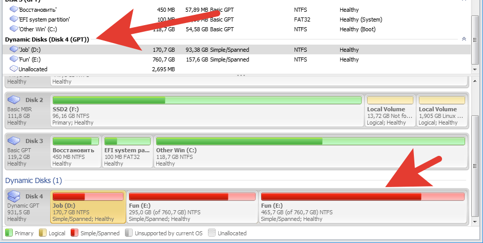 Лезу туда крайне редко, потому не могу сказать когда и после чего это произошло, то-ли как-то связано с установкой Linux (но ставил я его вообще на другой накопитель - SSD), то-ли это уже давно так, после того, как диск в динамический перевел (хотя это уже больше полугода назад сделал, раньше-бы заметил.. не понятно). В общем, имеется динамический HDD с составными томами, возможно-ли без потери данных "переделать" его в базовый с основными?