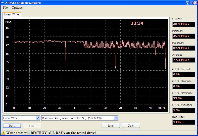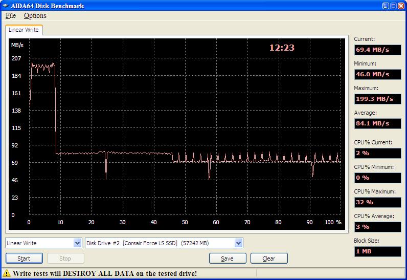 Добавлено спустя 14 минут 43 секунды: CORSAIR FORCE LS 60G (CSSD-F60GBLS), FW:9FM01.8. Первый и второй проходы теста Linear Write в ПО AIDA64. График в третьем проходе такой же, как и во втором. Стенд: iP4D925, i945G, ICH7R, iaStor.sys 11.2.0.1006. SSD подключался к стенду "на горячую".