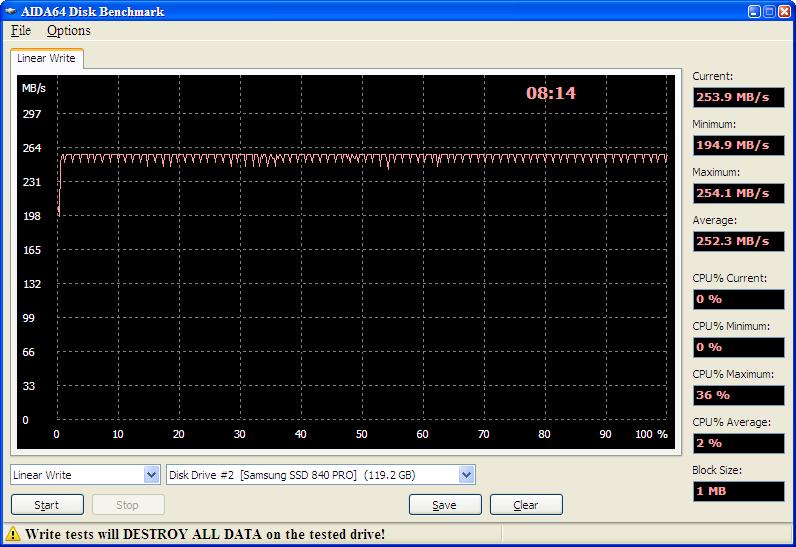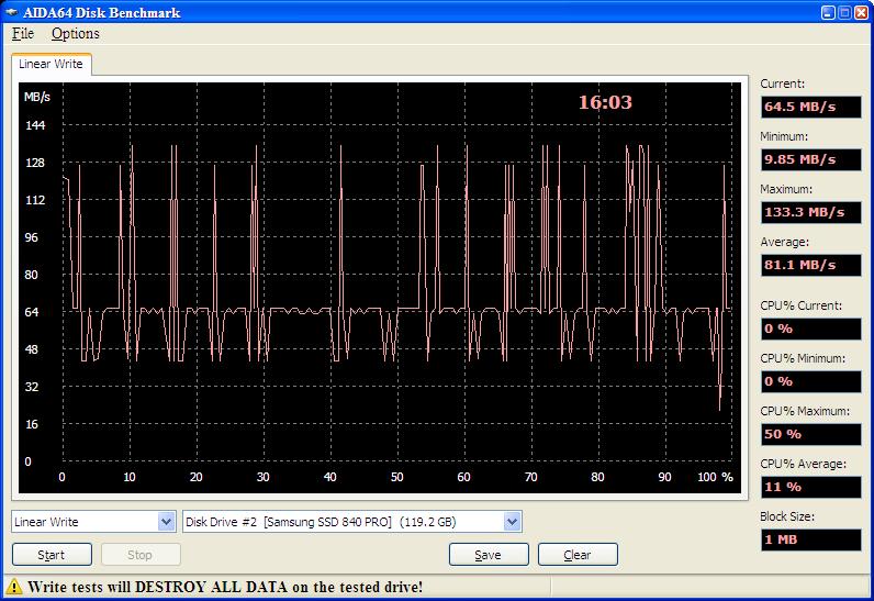 Samsung 840PRO 128G (MZ-7PD128), FW:DXM05B0Q. Первый и второй проходы теста Linear Write в ПО AIDA64. График в третьем проходе такой же, как и во втором. Стенд: iP4D925, i945G, ICH7R, iaStor.sys 11.2.0.1006. SSD подключался к стенду "на горячую". Не понятно, почему такой странный график в первом проходе? Чего, Samsung - птица гордая? Не пнёшь, не полетит?