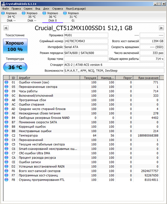 Удалил раздел, полная очистка средствами HD Tune Pro, проверка ей же красных блоков не показал, новый репорт от Кристал диск инфо. Посмотрите, что скажете?