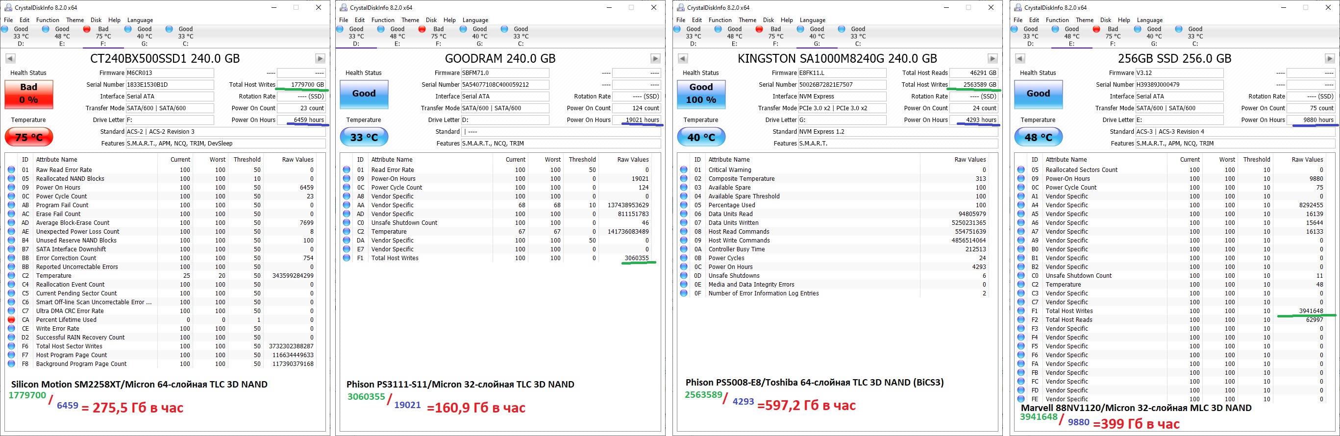 Нужно учесть, что 2258хт с фикс. кэшем вроде был только BX500 и то в "начале" продаж (потом пошло 1\3) - видимо это значительно влияет на скорости (и тормоза-затыки) и ресурс записи. На 3дньюз и у "чудика" как раз был вариант с фикс. кэшем, поэтому они неслабый ресурс показали. ЗЫ. прям как mx500, i545 (фикс. кэш) и остальные на 2258.