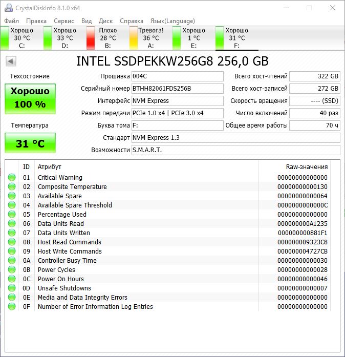 Приобрел около недели назад INTEL 760p SSDPEKKW256G8 Установил через адаптер PCIE-M.2, так как слота M2 на старенькой материнской плате не было. Конечно, учитывая моё старое железо и при таком подключении я не рассчитывал на заявленные эталонные чтение/запись 3210/1315 MB/s. Реальная скорость оказалась 1600/600. Меня это вполне устроило для моих задач.