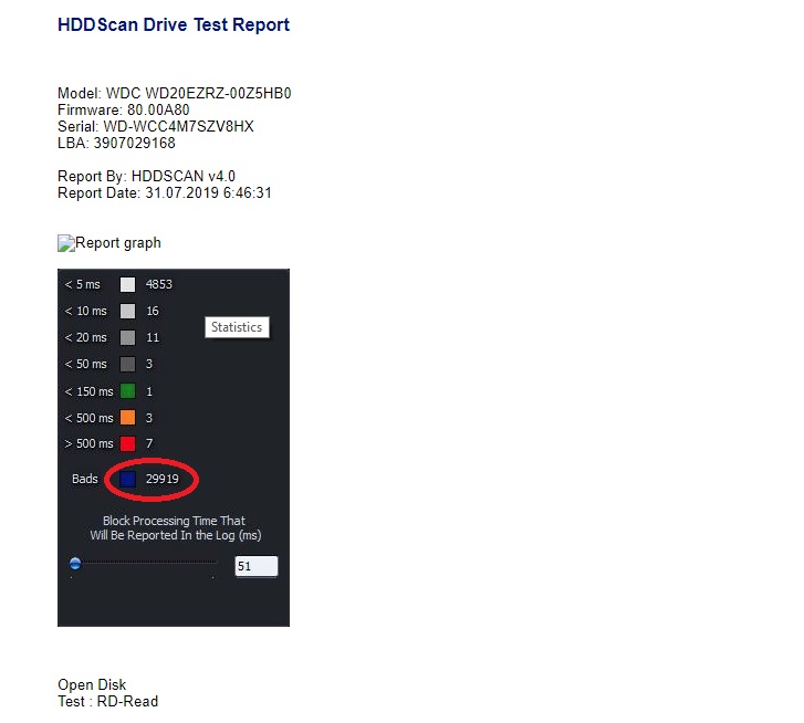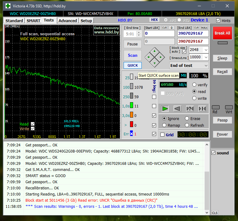 Провел чтение викторией, что скажите, всё печально тут? До этого тут писал пост в hdd scan проверял, там после минуты чтения сплошняком идут синие блоки. Тут хоть тест до конца нормально дошел.