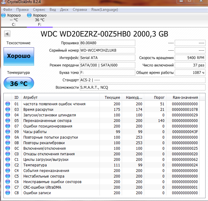 WDC WD20EZRZ-00Z5HB0 ---------------------------------------------------------------------------- Model : WDC WD20EZRZ-00Z5HB0 Firmware : 80.00A80 Serial Number : WD-WCC4M7SZV8HX Disk Size : 2000,3 GB (8,4/137,4/2000,3/2000,3) Buffer Size : Неизвестно Queue Depth : 32 # of Sectors : 3907029168 Rotation Rate : 5400 RPM Interface : Serial ATA Major Version : ACS-2 Minor Version : ---- Transfer Mode : SATA/600 | SATA/600 Power On Hours : 8237 ч Power On Count : 769 раз Temperature : 28 C (82 F) Health Status : Тревога! Features : S.M.A.R.T., 48bit LBA, NCQ APM Level : ---- AAM Level : ---- Drive Letter : D: