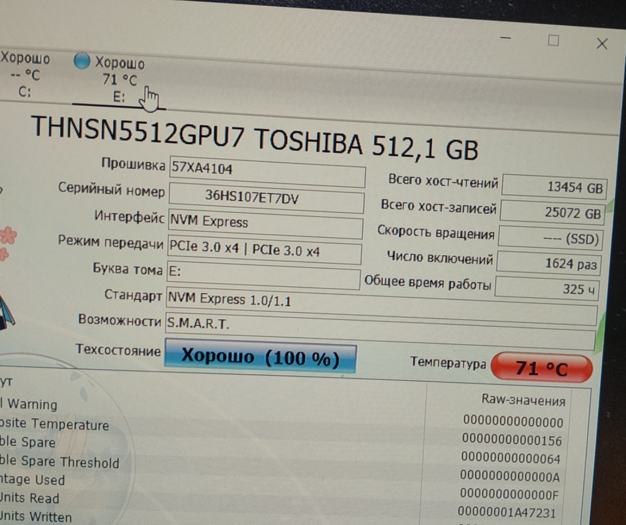 Всем привет. Пользуюсь Dell XPS 13 9360, в нем установлен SSD LiteOn CX2-8B256-Q11 на 256Gb (чтение 1600/запись 800). Есть возможность за символическую плату поставить Toshiba THNSN5512GPU7 на 512 GB (чтение 2700/запись 1600). История Toshiba неизвестна, но смущает следующее: 1) хост-записей согласно SMART на 25Тб (для сравнение у моего LiteOn за 2 года использования ноута всего 6Тб. Фото SMARTов прилагаю. 2) Согласно CrystaDiskInfo температура Toshiba 43 Градуса в состоянии покоя, для сравнения температура LiteOn 30-32 градуса (оба SSD без радиатора охлаждения). Если прогонять CrystalDiskMark, то согласно показаниям CrystalDiskInfo Toshiba греется до 71 градуса, LiteOn для сравнения максимум до 52 градусов. 3) 25Tb хост-записей это много? Не понимаю как надо эксплуатировать диск, чтобы хост-записей было почти в 2 раза больше чем хост-чтений.