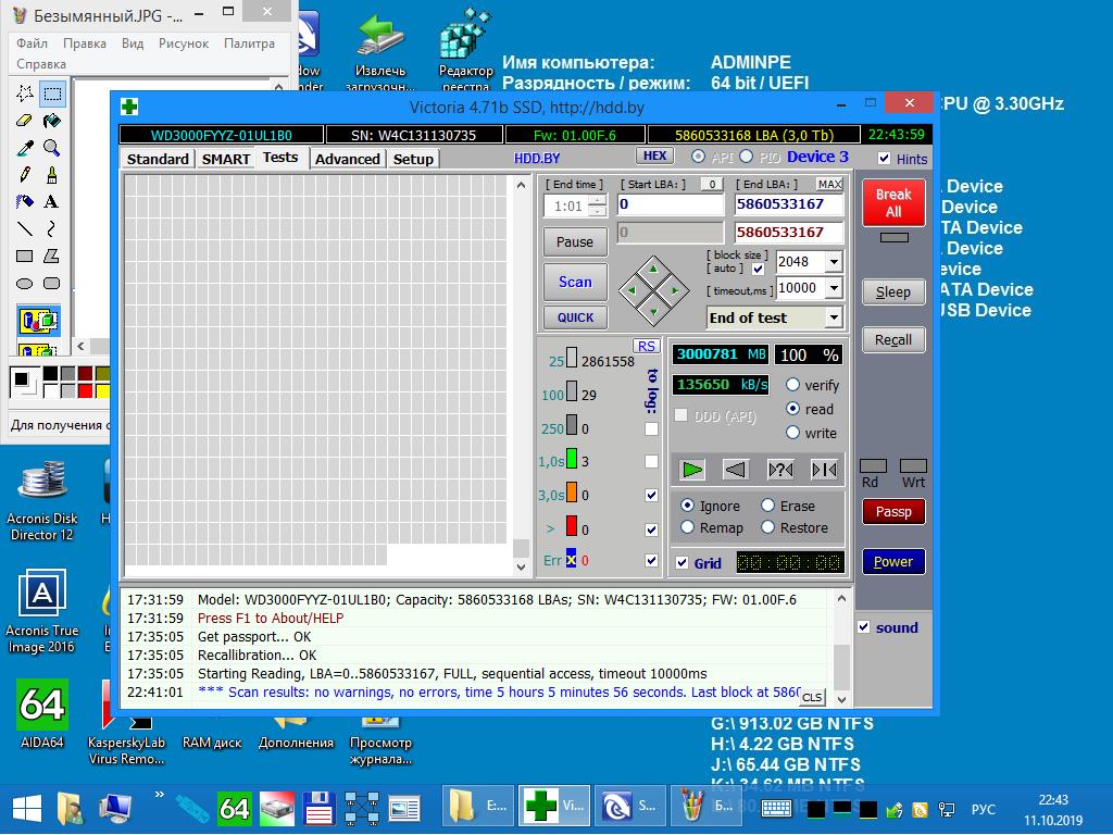 В прошлый раз мне посоветовали занулить весь диск викторией, чтобы ошибки ушли. Весь диск занулять я не стал, мне некуда скидывать данные. Я отформатировал только диск С, переставил винду, заменил кабель и сделал проверку поверхности. Тест был вроде норм: