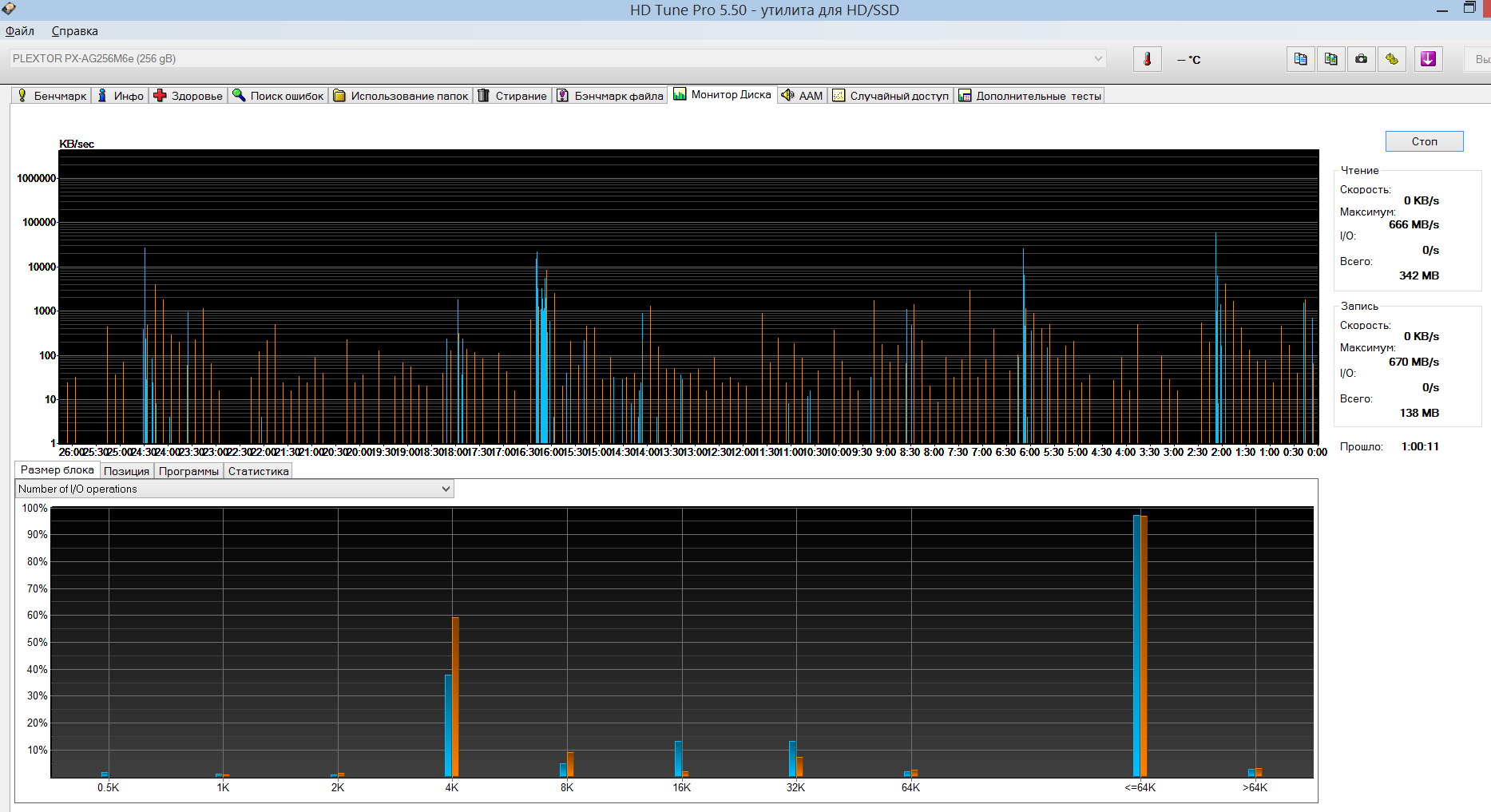 Общее количество IO чтения <=64к = 17000. Если сложить все IO от 512 до 64к, то получается 13035. С записью тоже самое: <=64к - 7534, сумма от 512 до 64к - 6380. Какими блоками ещё могли быть IO 3965 чтения и 1154 записи, которые не показывает HD Tune Pro 5.50?
