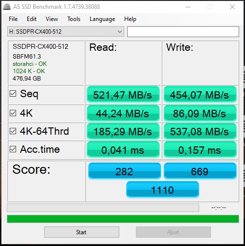 И так. Я купил GoodRAM CX400 512Gb. На пустой прогнал AS_SSD_Benchmark_1_7. Может кому-то будут полезные данные тесты. Тестил на MSI G43-Z87, 4690K(4.5GHz, фиксированый множитель).