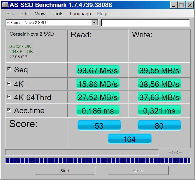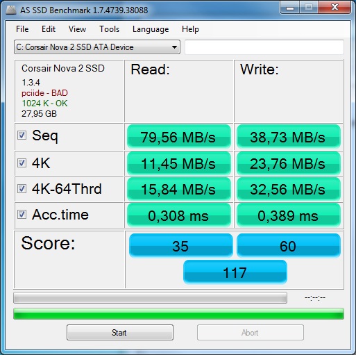 Joker!, э-э-э-э... этот SSD (Corsair Nova 2 30G FW:1.3.4 на SF-2141) имеет практически такие же цифры и на iP4D925 (2x3000МГц)/i945G/ICH7R/iaStor 11.2.0.1006. Разница в производительности между Athlon XP 1500+ и двухядерным iP4D925, да ещё и AHCI, очень заметна. А у The_Immortal Vector 150 имеет худшие показатели на Samsung NP-R70, чем мой Corsair Nova 2 на SIS735.