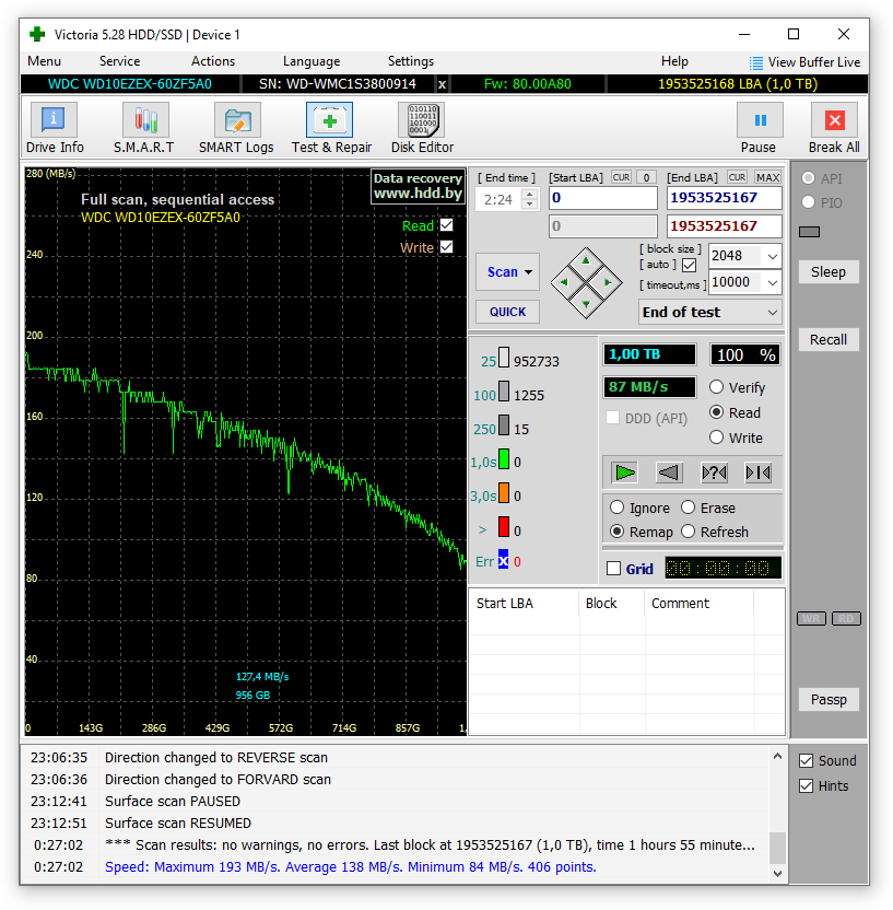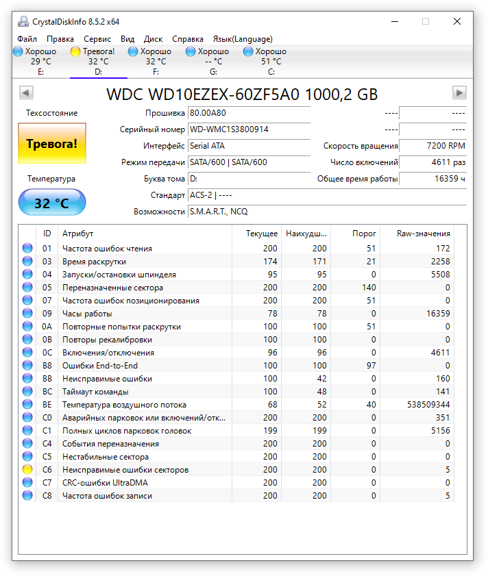 Всем привет. Есть диск Western Digital Caviar Blue 1TB WD10EZEX которому 7 лет. На днях почувствовал что что-то с ним не так, глянул SMART. CrystalDiskInfo выдал нестабильные сектора и неисправимые ошибки секторов. Сделал бэкап, форматировал, теперь CrystalDiskInfo выдал только неисправимые ошибки секторов. Victoria тоже пишет uncorrectable ecc errors, offline uncorrectable sectors count и multi zone error rate. Медленно форматировал и запустил Victoria тест с Remap, результат вроде хороший. Диск для работы, поэтому важно знать, заменить или всё хорошо?