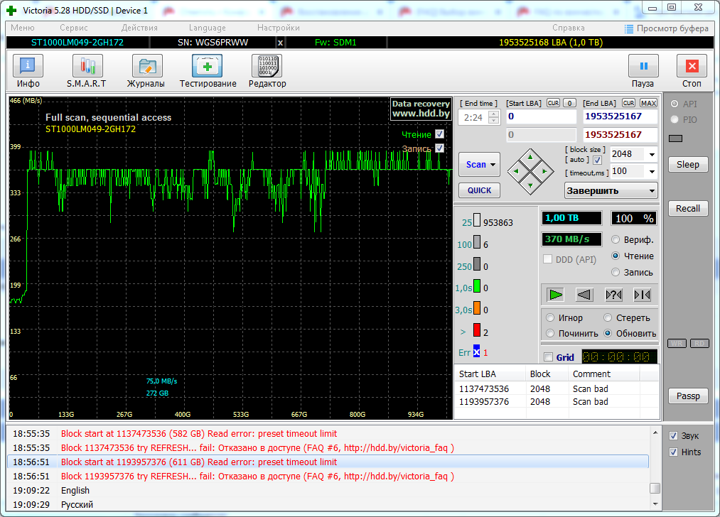 неужели все проблема из за одного битого сектора? еще удивила скорость чтения в 370мб/с хотя по тестам у него примерно 180 на чтении. обидно что диск еще на гарантии ему полгода всего. но смарт зеленый. подскажите куда копать , програмная ошибка или физическая?