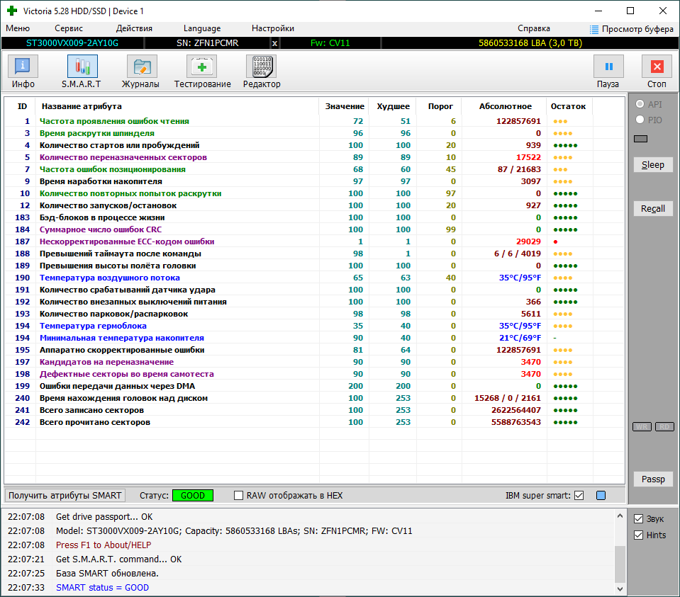 Но если бы у меня подобный диск стал вести подозрительно и барахлил, - то я бы сразу стал бы пересоединять этот проблемный 3TB на другой(ие) ПК, также пробовать на USB, - т.е. у меня он сразу бы подвёргся бы испытаниям. Однако традиционно, я не приверженец сторонних утилит кроме как от производителя. (Производители дисков не признают результатов испытаний на "левых" прогах для открытия гарантийного случая.) (Извините за моё многословие, и если я не смог объяснить.)