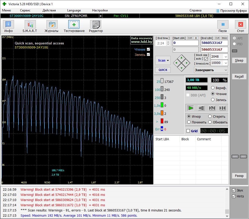 Приветствую! В системе имеется жесткий диск Seagate SkyHawk 3Tb (ST3000VX009), в пользовании с февраля 2019 г. Данных на нём никаких на данный момент нет, восстанавливать ничего не нужно, вопрос лишь в его состоянии...