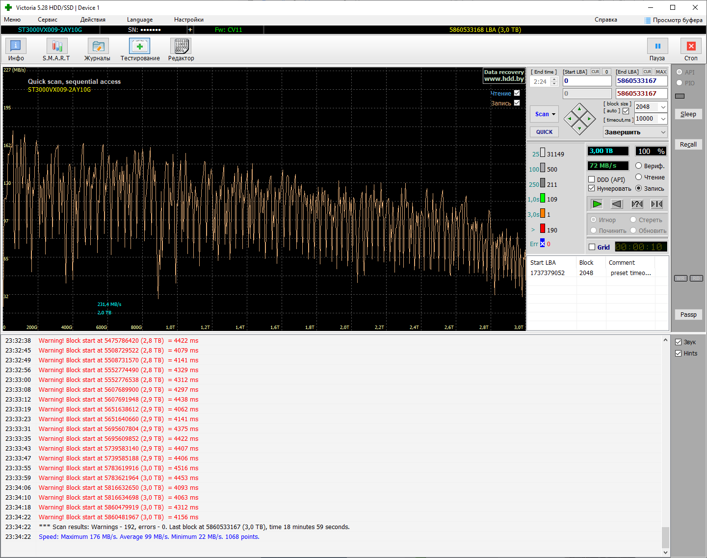 Можно поподробнее? Какой режим выбрать и т.д. Попробовал сделать полный скан, поставив галочку на "запись" - за ночь просканировал только 1,5 Тб (половина диска) и сплошные ошибки... в итоге выключил.