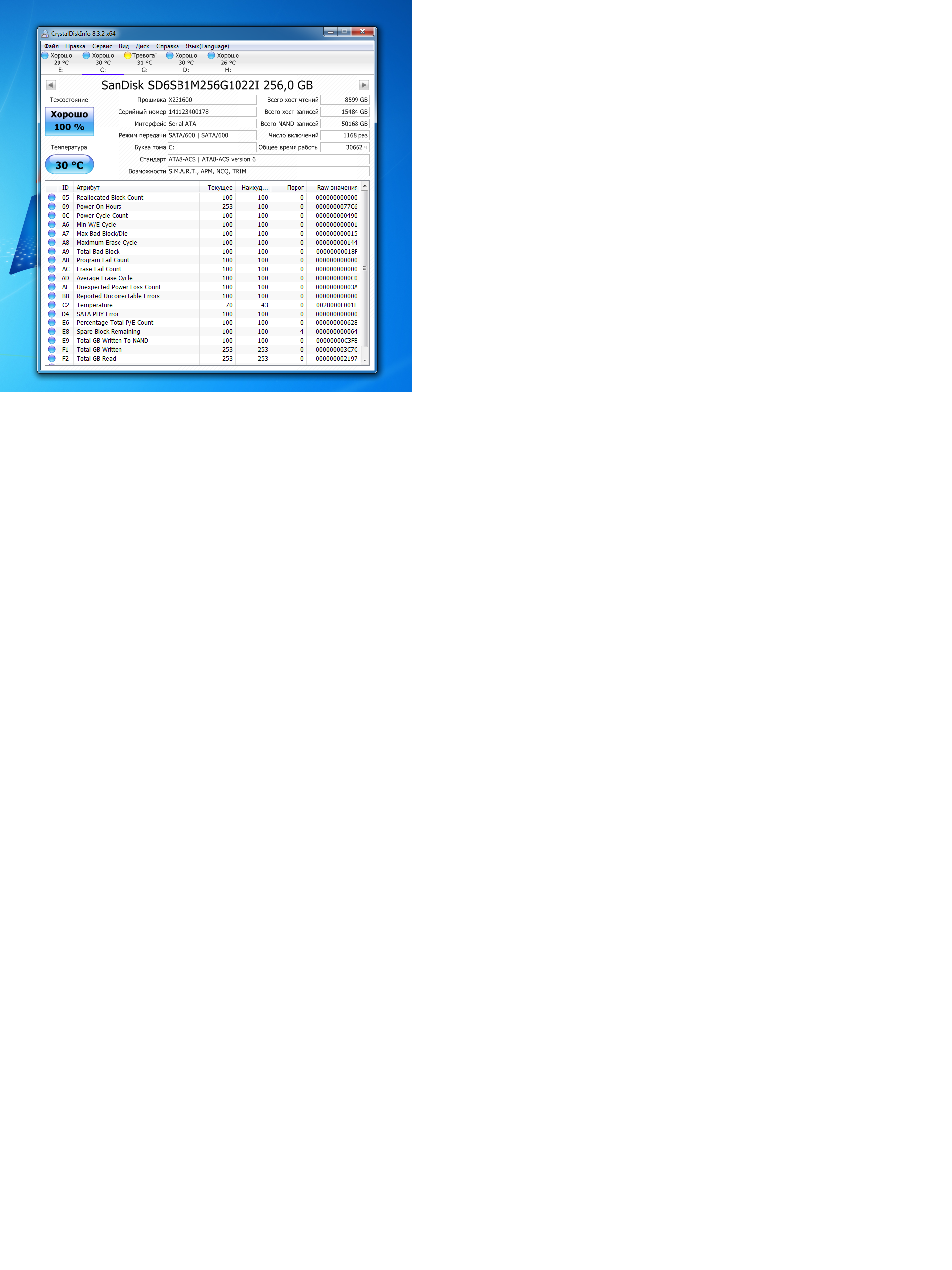 7. Для того что бы оценить состояние диска SSD воспользуйтесь прогнраммой Crystal Disk Info. Перед выкладыванием скриншотов Crystal Disk Info в меню Сервис>Дополнительно>Raw-значения выберите вариант "10 [DEC]" это несколько упростит восприятие информации.
