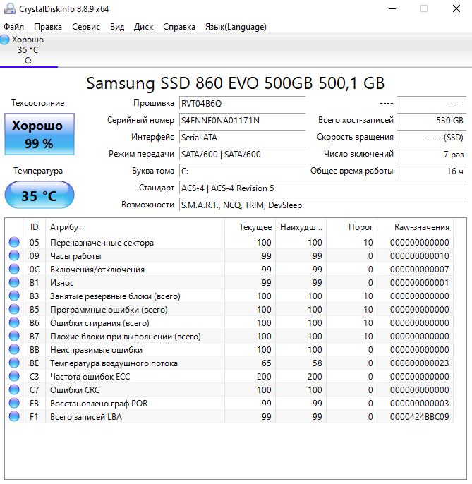 Приветствую всех! Вчера обновил все железо кроме видеокарты и корпуса, в том числе купил SSD Samsung 860 EVO 500Gb. Скорость очень радует, но насторожило что когда сразу после установки винды Crystal Disk Info показал здоровье диска 100%, а сегодня спустя установки нескольких игр в Стиме (на диске занято 330 Гб) Crystal Disk Info показывает уже 99% здоровье. Что это, брак, глюк? Конфиг в профиле. Скрин s.m.a.r.t.: