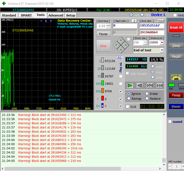 Переназначенные сектора растут и пытался прогнать викторией тест, там кардиограмма, как писали выше. Тест занял 2.5 часа и только 14%. Другой сбойный жесткий на 2 тб за это время целиком прогоняет. А и тестил в винде, но система стоит на другом диске. На "пациенте" не работало ничего.