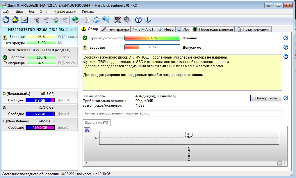 Всем приветище! Ноутбук Lenovo ideapad 320-15IKB Очень радовался модельке, т к купил более трёх лет назад за 550$..а буквально через месяц она стала стоить 700 )) В нашей торговле так часто бывает )) С завода установлен SSD на 256гб. Ноут рабочий, соотв и выключается редко.. периодически делаю резервное копирование данных, но тем не менее мало ли,что называется.. не пора ли мне присмотреть новый SSD? Хотя я уже готов и обычный 2.5" поставить, если SSD реально готов умирать каждые 3-4 года активного использования )) Тем более уже нашёл вариант с 500гб 2.5" 7200 оборотов новый и в районе 27$. Но реально ли отдаёт концы мой SSD ? Спасибо!