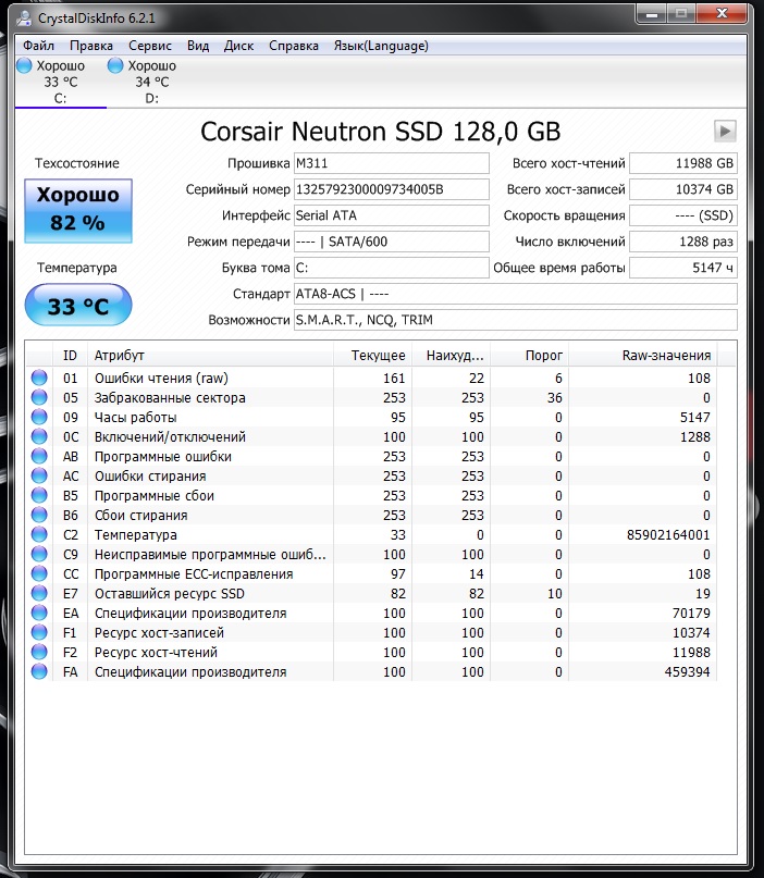 1. Переключаетесь в BIOS на AHCI (Если помимо SSD есть Raid-массив то там должен стоять RAID). Делается это до чистой установки Windows. Если производится перенос Windows Vista/7, то устанавливается патч Windows вот этим, для включения AHCI. Если AHCI не получается найти в BIOS, стоит поискать новую версию BIOS к мат.плате. Подключать SSD накопитель следует к чипсетным разъёмам, то же касается при выборе между чипсетным Sata II и Marvell/ASMedia/JMocron. 2. Скачиваете и ставите драйвер AMD_AHCI или Intel_RST Ссылки на драйвера ниже. (Устанавливать данные драйвера при желании/необходимости, по наблюдениям во многих случаях с драйвером IRST[для чипсетов Intel] в бенчмаркингах немного увеличиваются результаты, а с AMD[для чипсетов AMD] наоборот - при установке вместо стандартного msahci(win7) наблюдается ухудшение результатов). Поэтому для начала стоит запустить тест AS SSD Benchmark, затем поставить драйвер, убедиться что TRIM работает см.пункт 4, далее снова тест скорости. Если скорость упала (кстати, эффект может проявиться и не сразу, а лишь через некоторое время), то лучше вернуть Microsoft драйвер MSAHCI через диспетчер устройств. 3. Резервирование места на диске. Рекомендуется оставлять на накопителе всегда не менее ~10% емкости, чтобы уменьшить усиление записи и повысить эффективность работы ITGС и TRIM. Создание разделов выполняется по своему усмотрению. 4. Для того чтобы узнать работает ли TRIM воспользуйтесь программой TrimCheck. (Проверить включена ли поддержка TRIM в ОС можно следующим образом: необходимо набрать в командной строке fsutil behavior query DisableDeleteNotify (необходимы права администратора). Если ответ будет 0, то TRIM работает и включен. Если ответ будет 1, то включить TRIM можно командой: fsutil behavior set DisableDeleteNotify 0. По умолчанию в Windows 7 TRIM включен). 4.1. Для того чтобы увидеть драйвер под которым работает диск, включен ли AHCI и выровнен ли раздел, следует просто запустить программу: AS SSD Benchmark. #77#77 Если выровнен и включен AHCI, то строка с выравниванием - зеленого цвета и заканчивается ОК. Если нет, то строка красного цвета и заканчивается BAD. Выравнивать с помощью Paragon Alignment Tool (PAT). 4.2. Для того что бы оценить состояние диска SSD воспользуйтесь SMART-монитором Crystal Disk Info. Перед выкладыванием скриншотов Crystal Disk Info в меню Сервис>Дополнительно>Raw-значения выберите вариант "10 [DEC]" это несколько упростит восприятие информации утилиты форумчанами. SSDLife показывает общую инфу о SSD и прогнозирует срок жизни. Прогноз её очень посредственный и вряд-ли ему стоит верить. 5. Отключить очистку буфера кэша записей Windows для этого устройства - галочка должна отсутствовать. Разрешить кэширование записей - обязательно включено. 6. Ставить на SSD рекомендуют Windows 7 и более новые (не Vista/XP/2003 и т.д.), а также Linux с ядром 2.6.33 и новее. Т.к. только в них реализована поддержка TRIM, при установке разделы создаются выровненными и по умолчанию произведены некоторые оптимизации. Хотя использовать SSD под управлением Windows XP можно, на накопителях с хорошей реализацией ITGC или при использовании стороннего софта для отправки на накопитель команды TRIM.