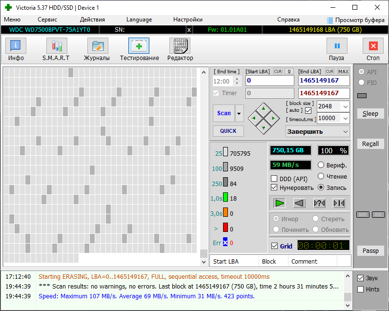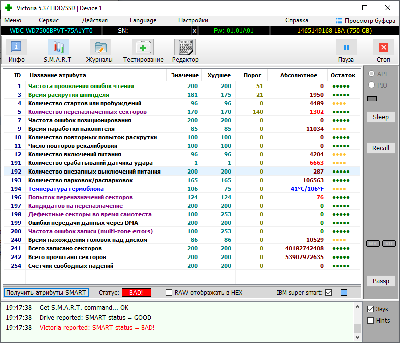 Есть у меня HDD на 750 Гб, который я хочу использовать под файлы разные. Он сейчас пустой, даже разделы не созданы. Проверил его состояние - вроде оно не очень (скриншот 2). Прогнал сканирование в режиме записи - результат на скриншоте 1. Victoria говорит плохой диск. Насколько плохой? Можно ли его использовать под файлы? Говорят ли данные по скриншотам, что диску скоро придет конец? Может подлечить его как-то можно?