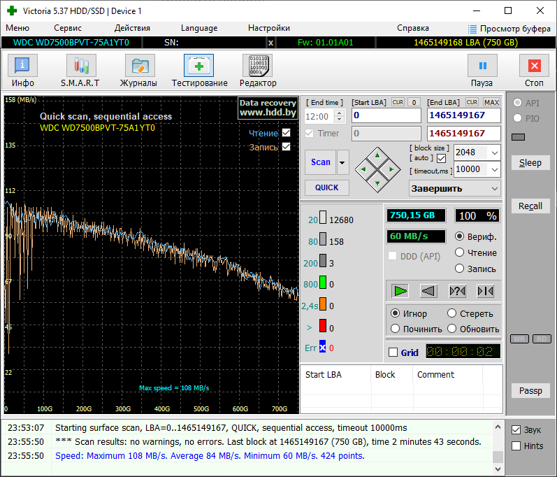 Спасибо большое за подсказки. Один вопрос остался. Выше на скринах по тестам D и E видно, что Start LBA в обоих случаях 0, End LBA - разный. Не означает ли это, что в первом случае проверка идет от начала и на 200 Гб, а во втором случае от начала и на 550 Гб? Таким образом последние 200 Гб диска не проверились ни в одном из тестов.