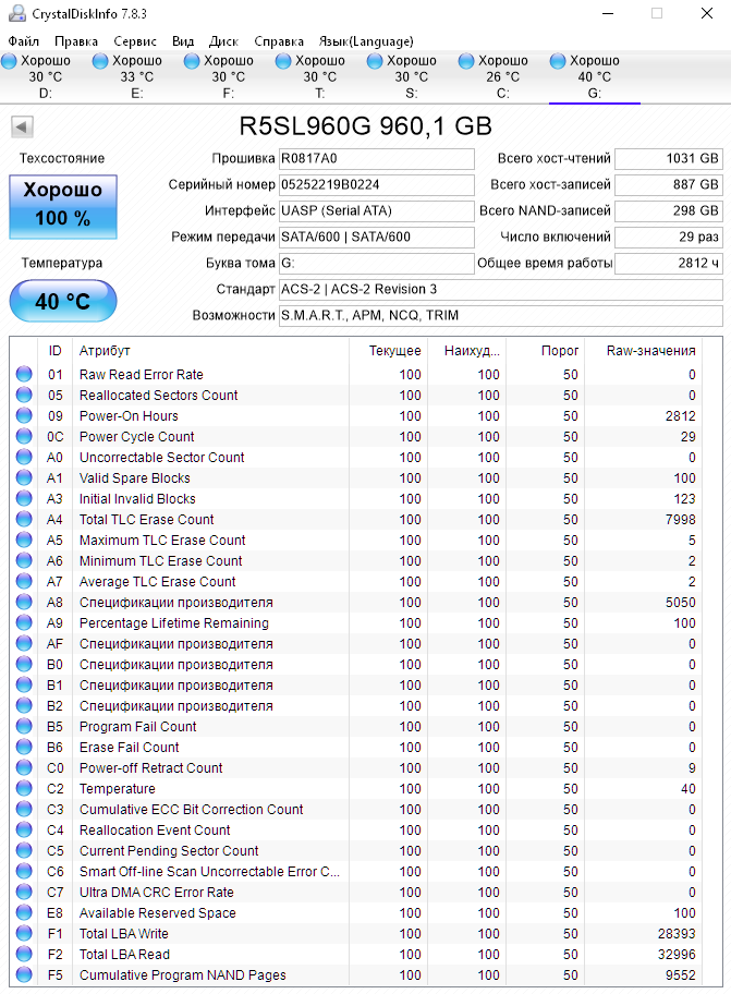 7. Для того что бы оценить состояние диска SSD воспользуйтесь прогнраммой Crystal Disk Info. Перед выкладыванием скриншотов Crystal Disk Info в меню Сервис>Дополнительно>Raw-значения выберите вариант "10 [DEC]" это несколько упростит восприятие информации.