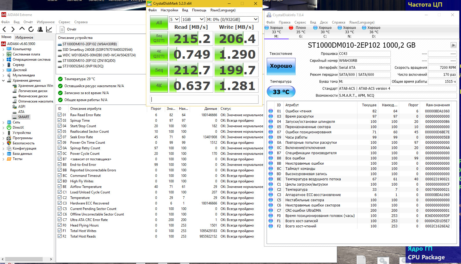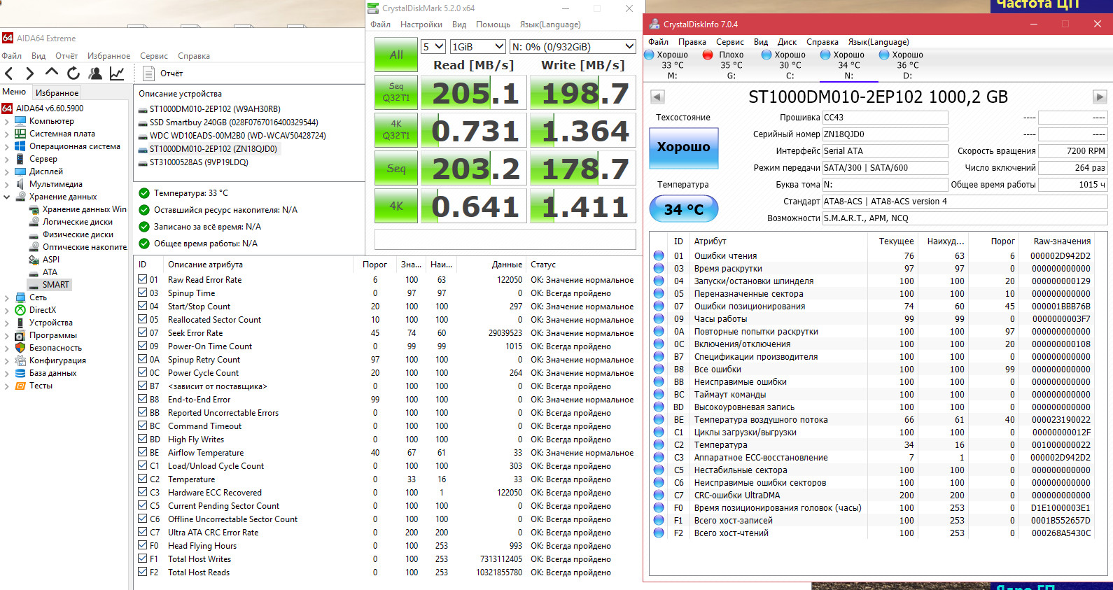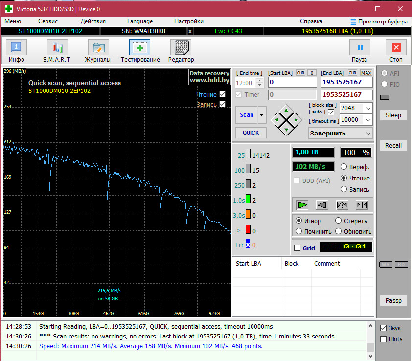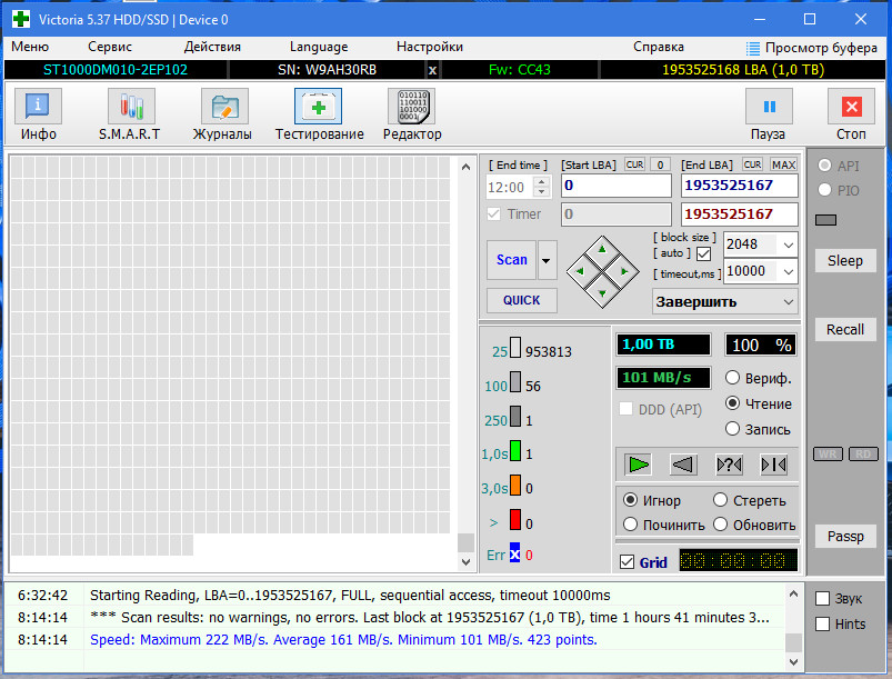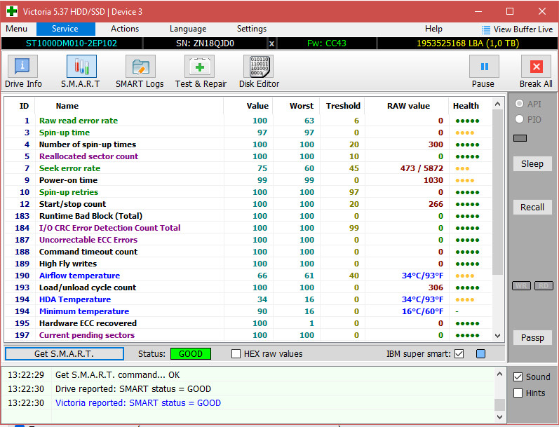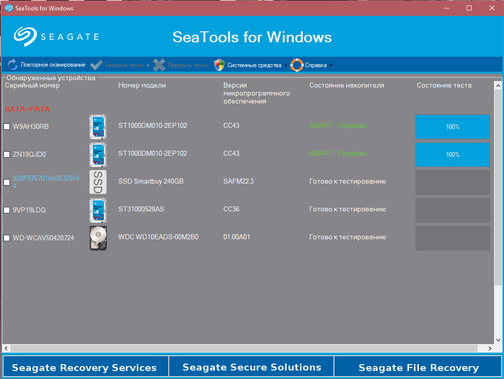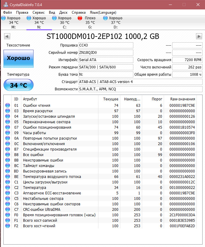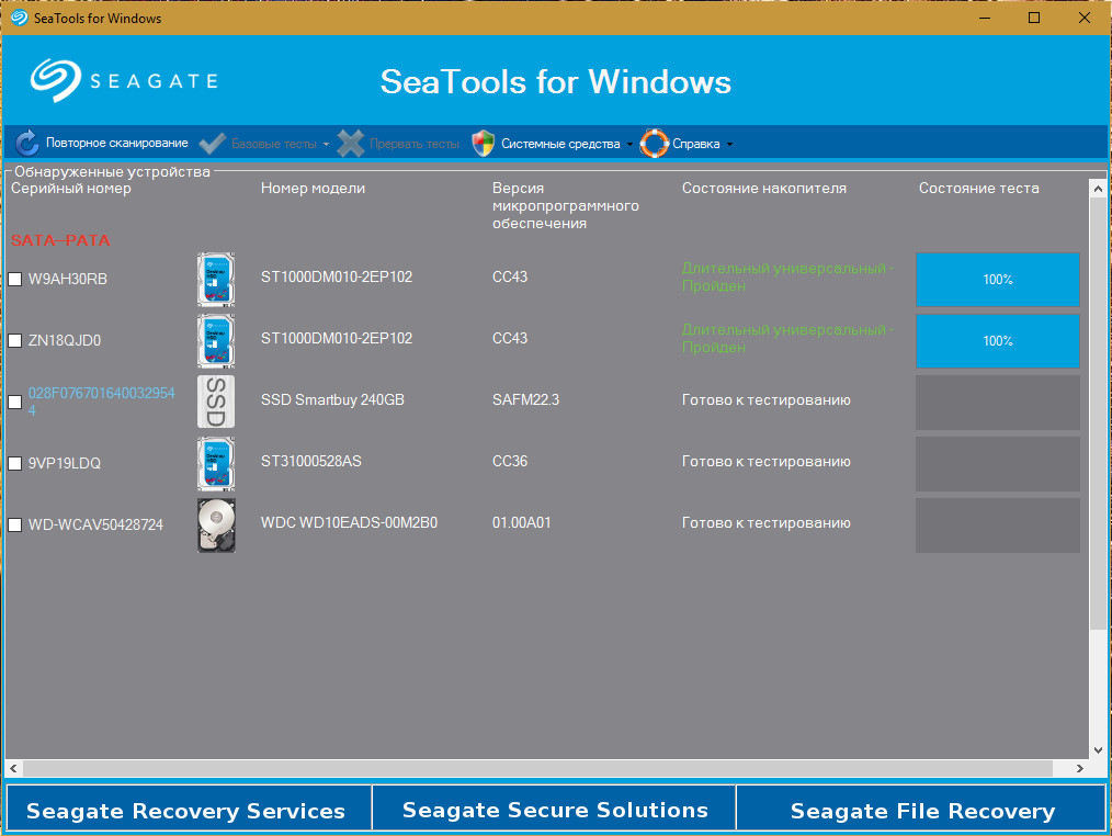 Все другие программы AIDA64, SeaTools, CrystalDiskInfo, CrystalDiskMark 5 с самого начала ни чего плохого в этих дисках не нашли. Только Виктория на них ругается, ладно хоть один из дисков подружился с ней. Просто все эти тесты Виктории, которые уже 3 дня гоняю, не вредят самим дискам? Я же не единственный у кого есть такие Seagate BarraCuda ST1000DM010, какой у вас статус Смарт в Виктории? Просто всегда разные результыты выдает Виктория после Чтения на одном и том же диске. Кстати этот диск подключен к Сата3 разьему материнки, остальные жесткие к Сата2