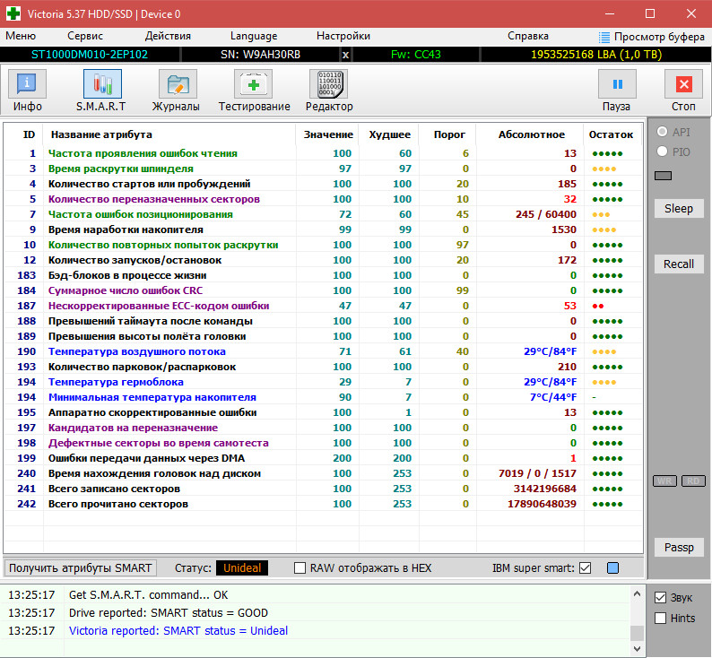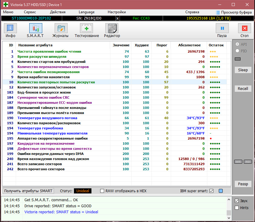 Здравствуйте, купил с рук два жестких диска Seagate Barracuda ST1000DM010-2EP102, оба 19 года выпуска, продавец дал "на словах" время мне их проверить и если что то не так можно будет вернуть. Проверяю и смотрю параметры жестких такими программами Victoria 5.37, SeaTools, CrystalDiskInfo, AIDA64. На первый взгляд всё нормально, малый срок наработки дисков, проходят тесты. Но вот Виктория на оба диска пишет статус Unideal когда открываю вкладку Smart, и показатель 195 Hardware ECC Recovered большое число, с красной одной точкой. В шапке темы написано что у Seagate есть какая то особенность на этот параметр, так можно не переживать из за этого?