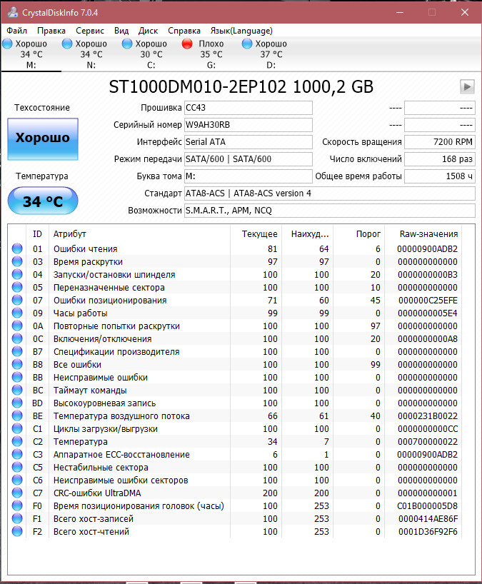drugqueen7 Если бы не С3 (195) ябы сказал что с винчестером по смарт все в порядке. Но сигейтов у меня давно не было не могу сказать насколько это критичный атрибут. Без порога, формально - не критичный. Но на деле не всегда так.
