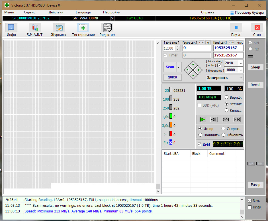 Добавлено спустя 8 минут 59 секунд: Второй диск запись прошел удачно, а вот чтение выявило одну ошибку, 1 синий сектор. Решил от этого сектора прогнать в режиме Стереть, и снова прогнал полный цикл Чтения, чтение прошел без ошибки, но статус Смарт так и остался Unideal