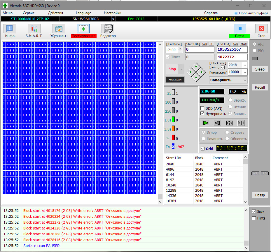 Тест на чтение оба диска прошли, а вот на запись какая та хрень, сразу все блоки с ошибкой (отказано в доступе), даже не стал прогонять полностью тест, остановил, сделал скриншоты. Виктория была запущена от имени администратора. Еще дополнительно диски прогнал в CrystalDiskMark 5. В SeaTools все тесты эти диски проходят, выше скидывал скриншоты. Так что с ними? 1 диск ST1000DM010-2EP102 (W9AH30RB)
