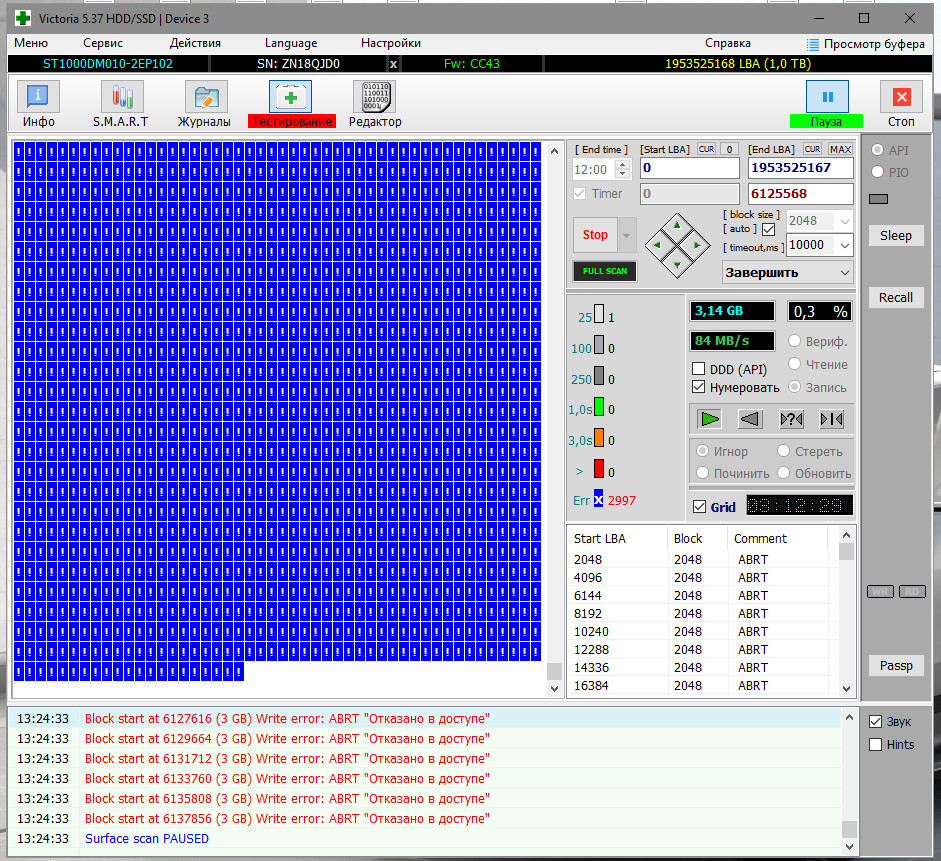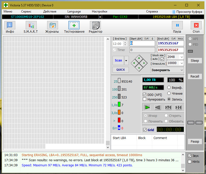 Добавлено спустя 3 часа 5 минут 33 секунды: Первый диск прошел тест записью, статус Смарт в Виктории не поменялся, так и остался Unideal. Второй диск запустил на тест записью, так же удалив том с него, в режиме нумеровать. Первый диск 3 часа проходил этот тест