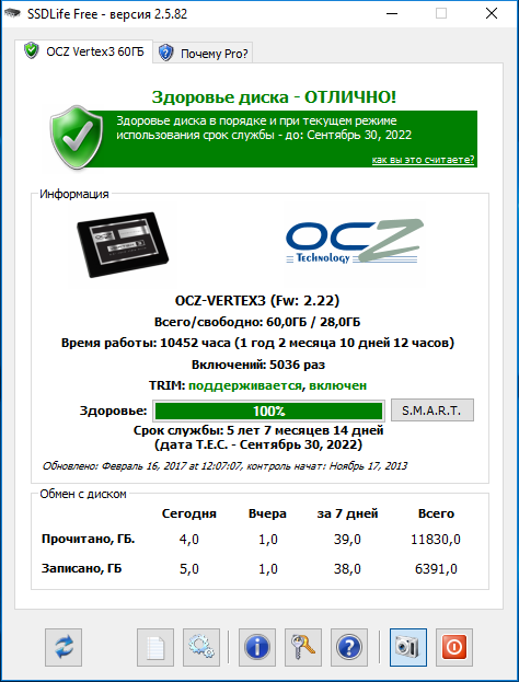 Может кому будет интересно, SSD OCZ Vertex 3 через 4 года использования, начиная с Windows 7 система только обновляется, сейчас Windows 10 64-bit, отключена только гибернация так как не пользуюсь.