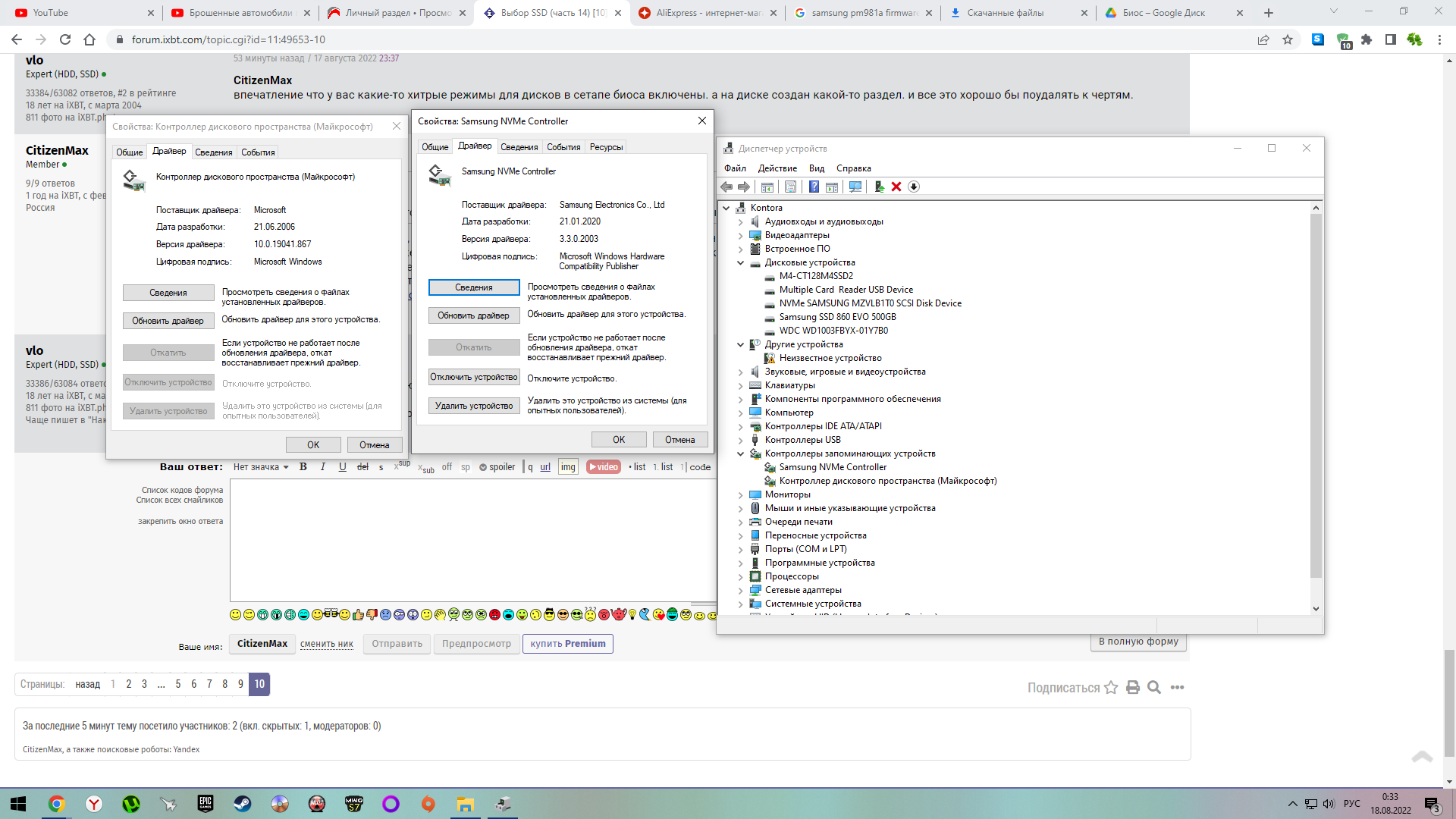Здравствуйте! Купил на Али по рекомендациям из профильной темы ссд Samsung PM981A. Установил диск в системник. Только вот диск никак в системе не отображается. В биосе и в диспетчере устройств есть. CrystalDiskInfo отображает характеристики, кроме объема. Пробовал переставлять во второй слот м2 и отключать другие накопители- ничего не помогает. Биос на материнке не трогал. Пытался через установку виндовс, а там этого диска нет. Если получится, то проверю на другом компьютере. Что можете посоветовать? Неужели я нарвался на брак (продавец с хорошими отзывами)? Понятно, что вариант с проверкой на другой системе лучший, но может ещё есть способы? Может нужно прошивку обновить? Система в профиле. Вот ссылка на фотографии, а то тут почему-то только 4 штуки можно присоединить. https://drive.google.com/drive/folders/ ... sp=sharing