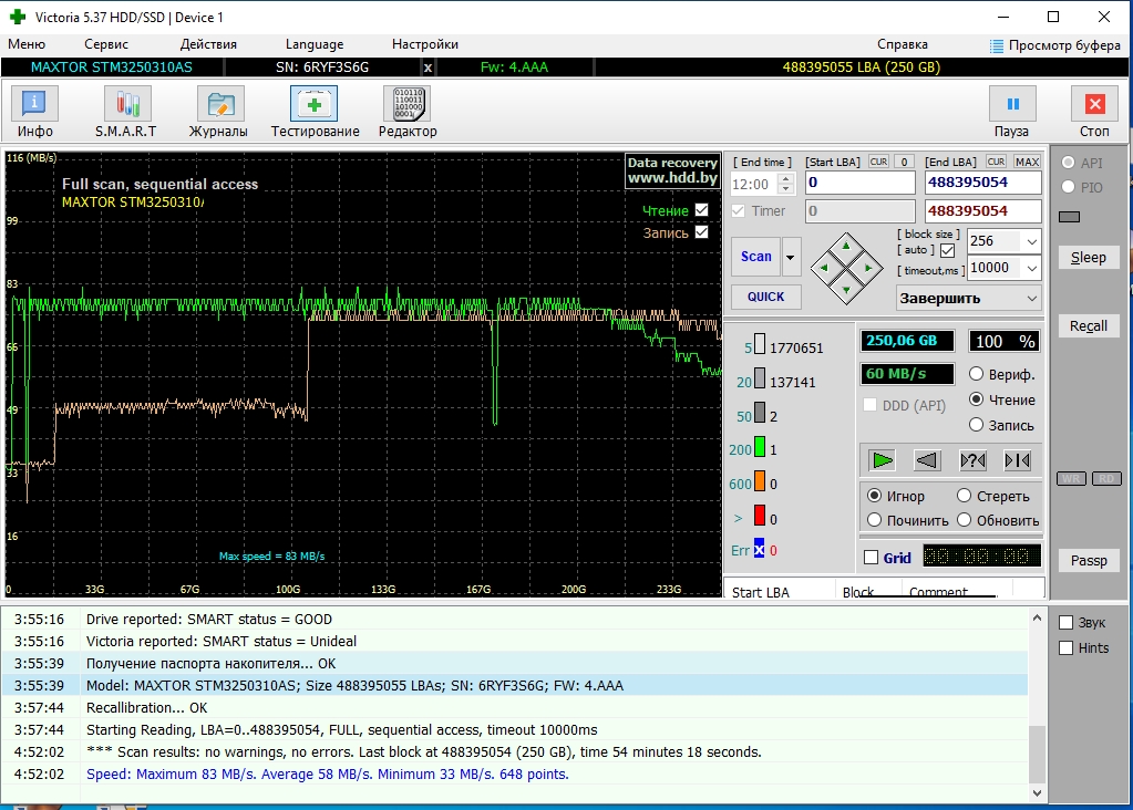 Добавлено спустя 1 час 9 минут 42 секунды: Maxtor STM3250310AS sata 2, на 250 гигов....началась проверка в Виктории с опцией "игнор - запись" со скоростью 36 mb/s, прошел 20 гигов и скаканул на 55 mb/s, дошла проверка до 90 гигов и скаканул на 80 mb/s. Чего интересно с диском не так? Далее ставлю проверку "игнор - чтение" он начинает с 36 mb/s, через один гигабайт подскакивает до 80 mb/s, через гигабайт падает ниже 30 mb/s, и тут же опять взлетает до 80 mb/s.