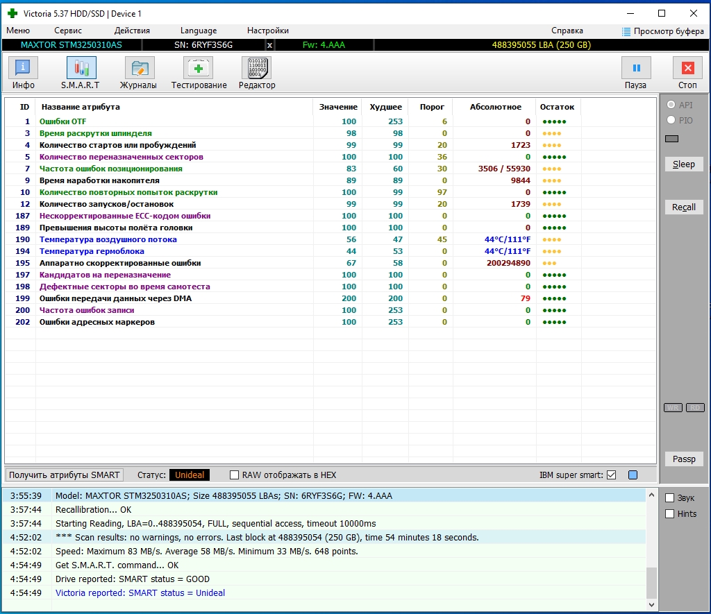 Добавлено спустя 8 минут 37 секунд: Такой еще вопрос, а Reallocated Sector Count....он лечится как то? Или же...что бы я не делал, эти ошибки все равно будут висеть в смарте? Что такое Reallocated Sector Count, это когда диск перенес 2 плохих сектора в резерв, или же это значит...что резерв заполнен и эти два битых сектора находятся на самом диске, то есть не в резерве, а на рабочей поверхности, где расположены файлы, папки и т.д?