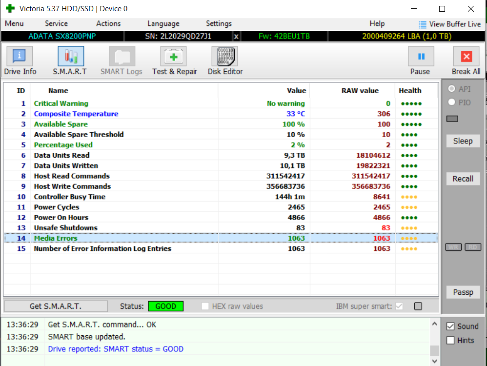 У меня ADATA SX8200PNP 1 TB начались зависания, я решил протестировать его и victoria находит 40 штук зелёных и бэдблоки есть, но до конца не доходит зависает. Тестировал утилитой от ADATA тоже зависает. Так то диск на гарантии от производителя до 2026 года, но это только если в тайвань отправлять. Может кто подскажет что то можно сделать? Хотя бы временно. Заказал другой диск, придёт через 2-3 дня, но сейчас нужно работать, виснет раз в полчаса комп. Если проверять поверхность диска то довольно быстро зависает.