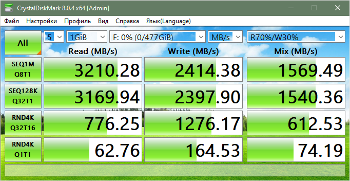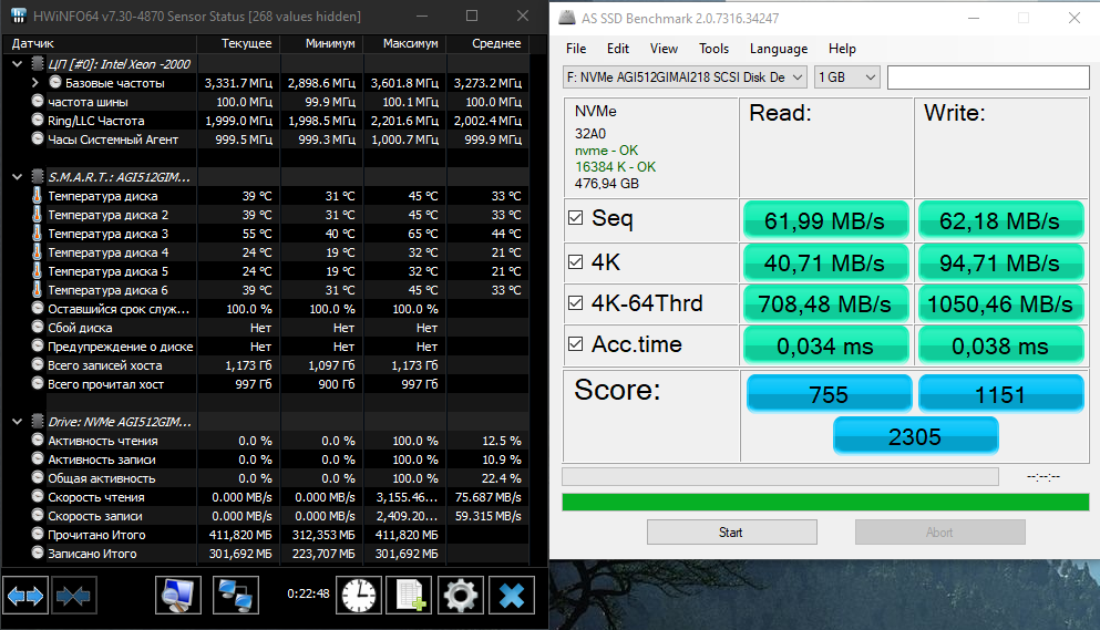 Многочисленные тесты выявили странную особенность. AS SSD показывает какую-то галиматью - скорость 50 Мб/с (Seq) и на чтение, и на запись. CrystalDiskMark - то, что и должно быть - 7000 Мб/c на чтение и 5000 Мб/c на запись. Причём для двух моих разных дисков PCIe Gen4×4. HDTunes что-то вроде 3500 Мб/c. То есть, каждая программа измеряет по-своему, и какие измерения считать правильными, совершенно непонятно.