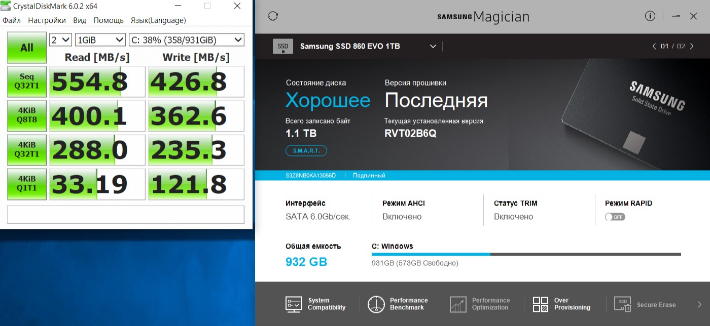 Привет! Купил 860 evo 1tb, занялся переносом двух других ssd на один новый. один системный раздел + один обычный переносил на новый диск и затем слил воедино, после чего расширив раздел до всего размера диска. Кароче говоря, тестил все диски, и мне показалось что при пустом только что созданном разделе на новом 860 я увидел около 1000 на линейное чтение и 1500 на запись в кристалл-марке. Сейчас я все разделы перенёс и слил воедино на новый диск как надо, и показатели стали гораздо хуже. Этол я ошибся в первых измерениях и не то мерил скорее всего, или у меня что-то с диском\разделами? Или это нормальная скорость ? Sata 6гбит, magician подтверждает.
