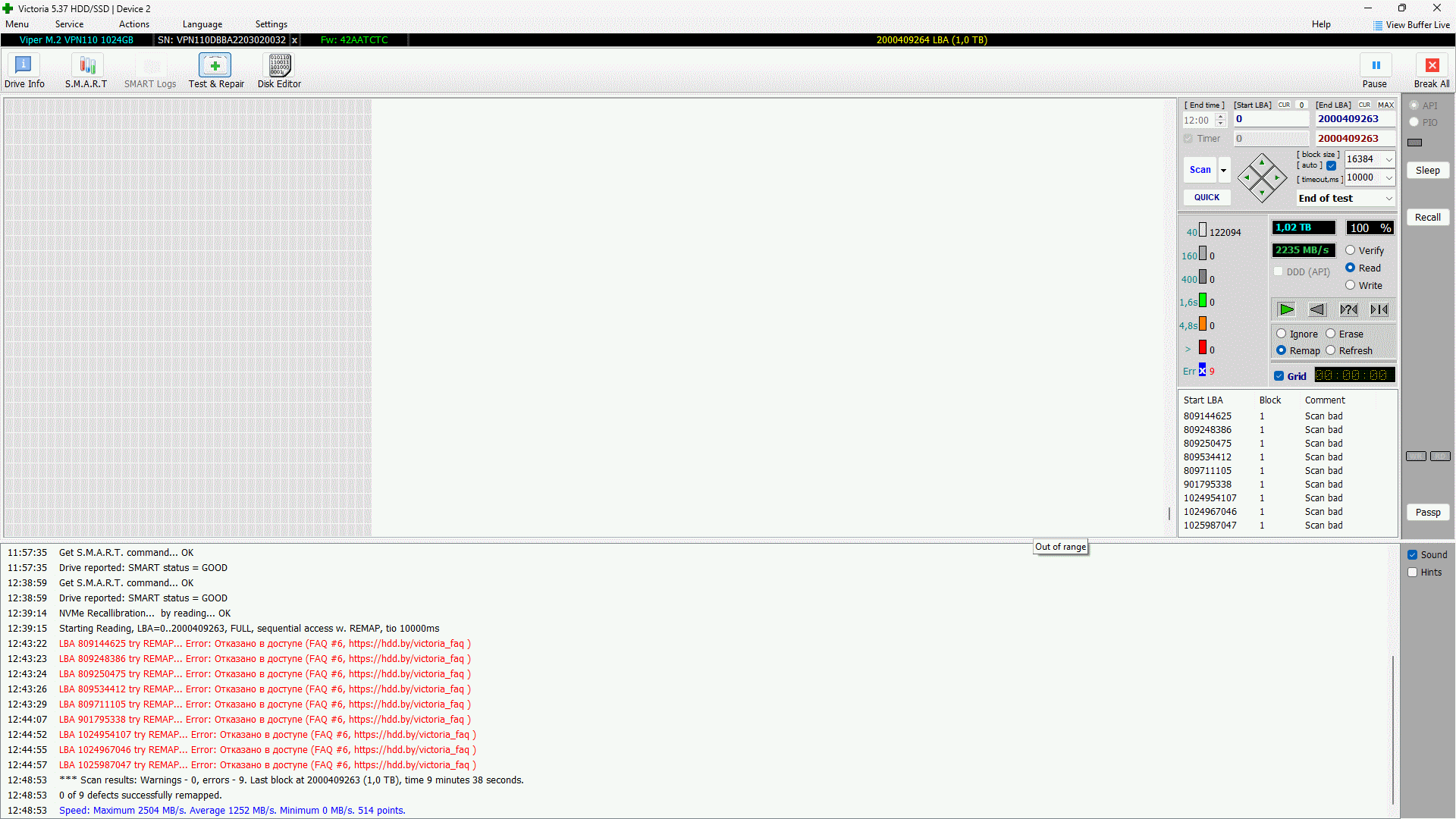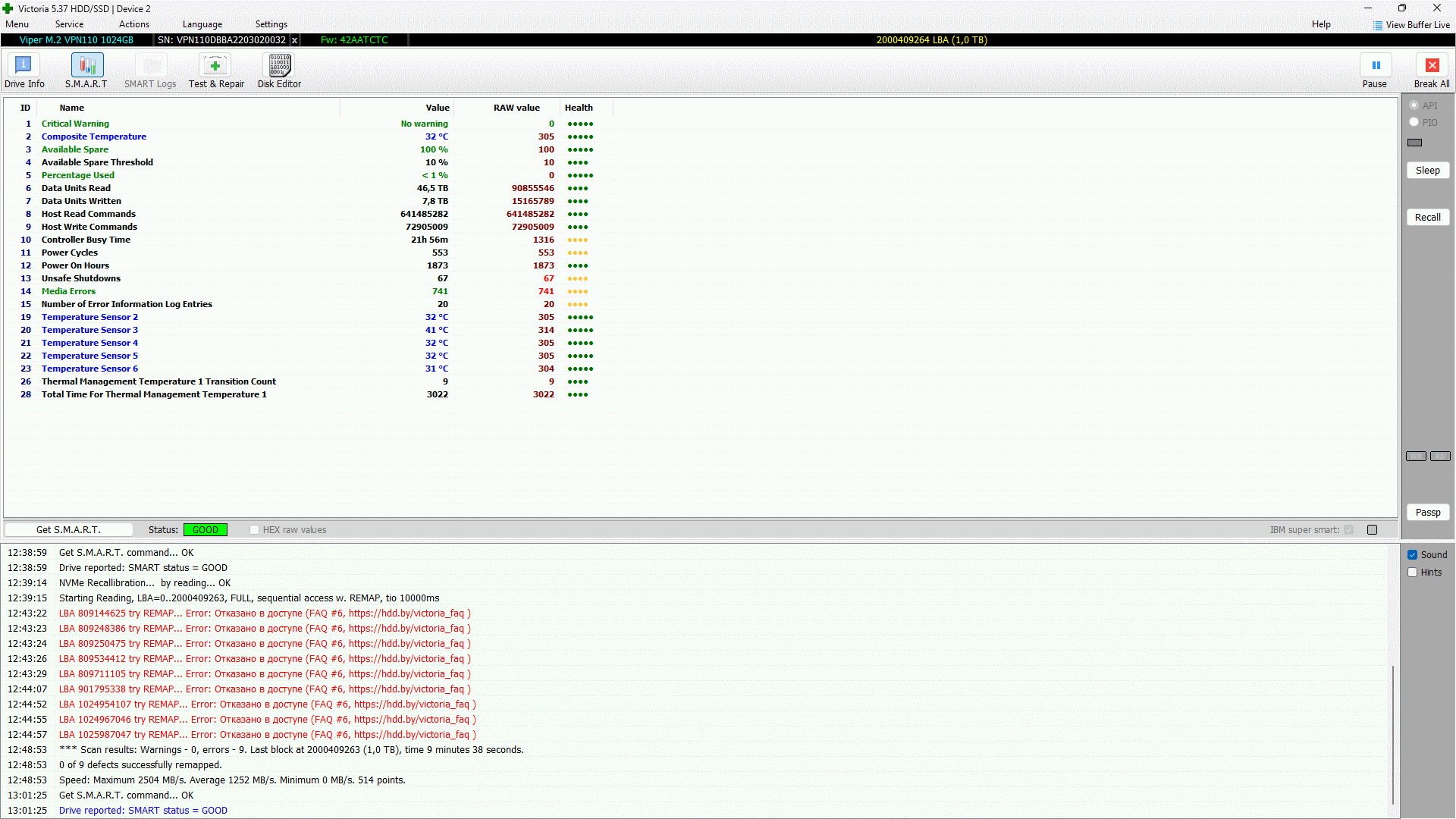1. Что это могло быть? 2. Как теперь обращаться с этим vpn110? 3. Как избежать перегрева? Корпус хорошо продуваем, вентили на турбо в простое и на максимуме при 50C на cpu. 4. Можно и нужно ли как-то принудительно ограничить скорость записи и/или напряжение/энергопотребление на nwme? 5. Что делать с 9-ю бэд блоками? После каждого скана Викторией их количество в smart возрастает на 9. Так понимаю, ремап на ssd в принципе сделать нельзя. А можно ли хотя бы понять, затронули ли эти битые блоки какие-то файлы и что прошивка контроллера с ними там дальше делает, юзает ли их как-то или заменила другими?